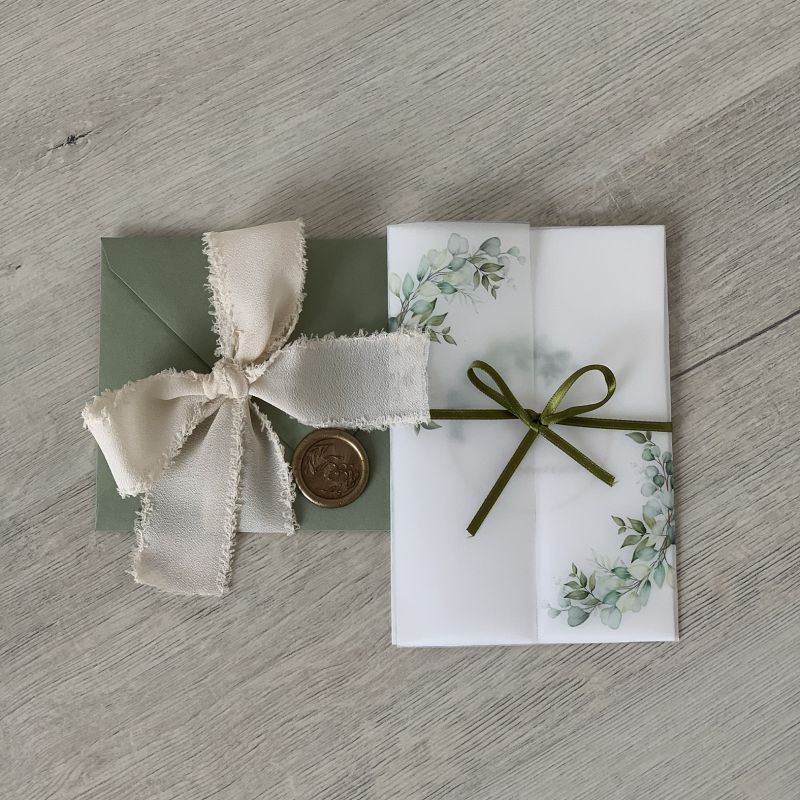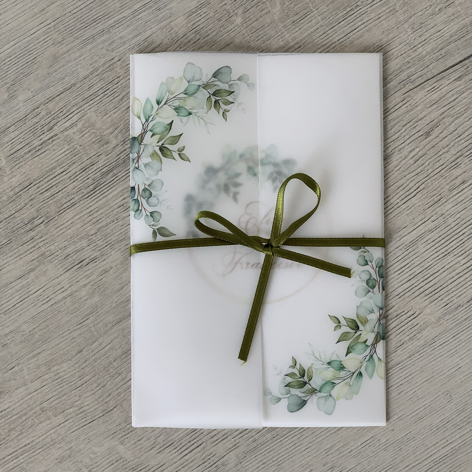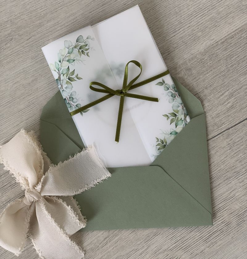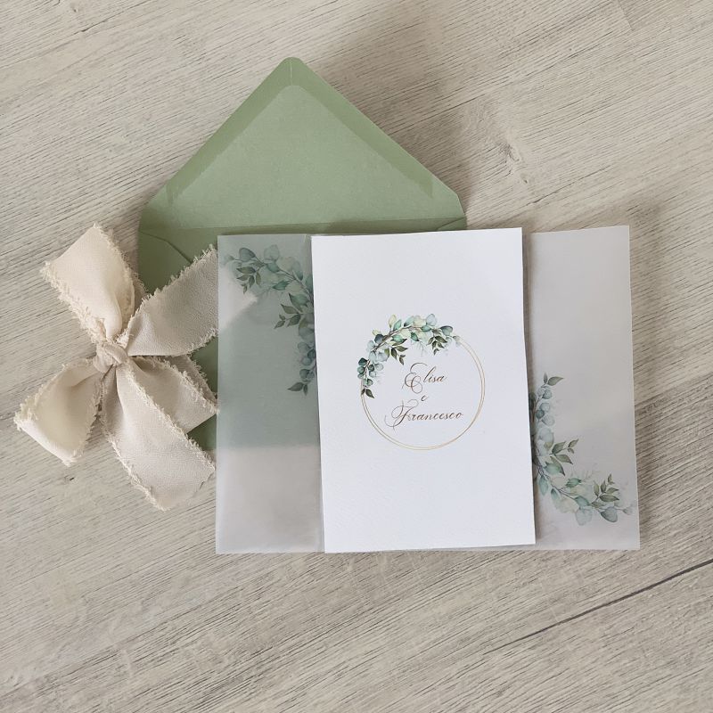 Composte da una velina trasparente con stampa "eucalipto" chiusa da nastrino in raso verde + cartonicno martellato stampato fronte+retro con i dati personalizzati.