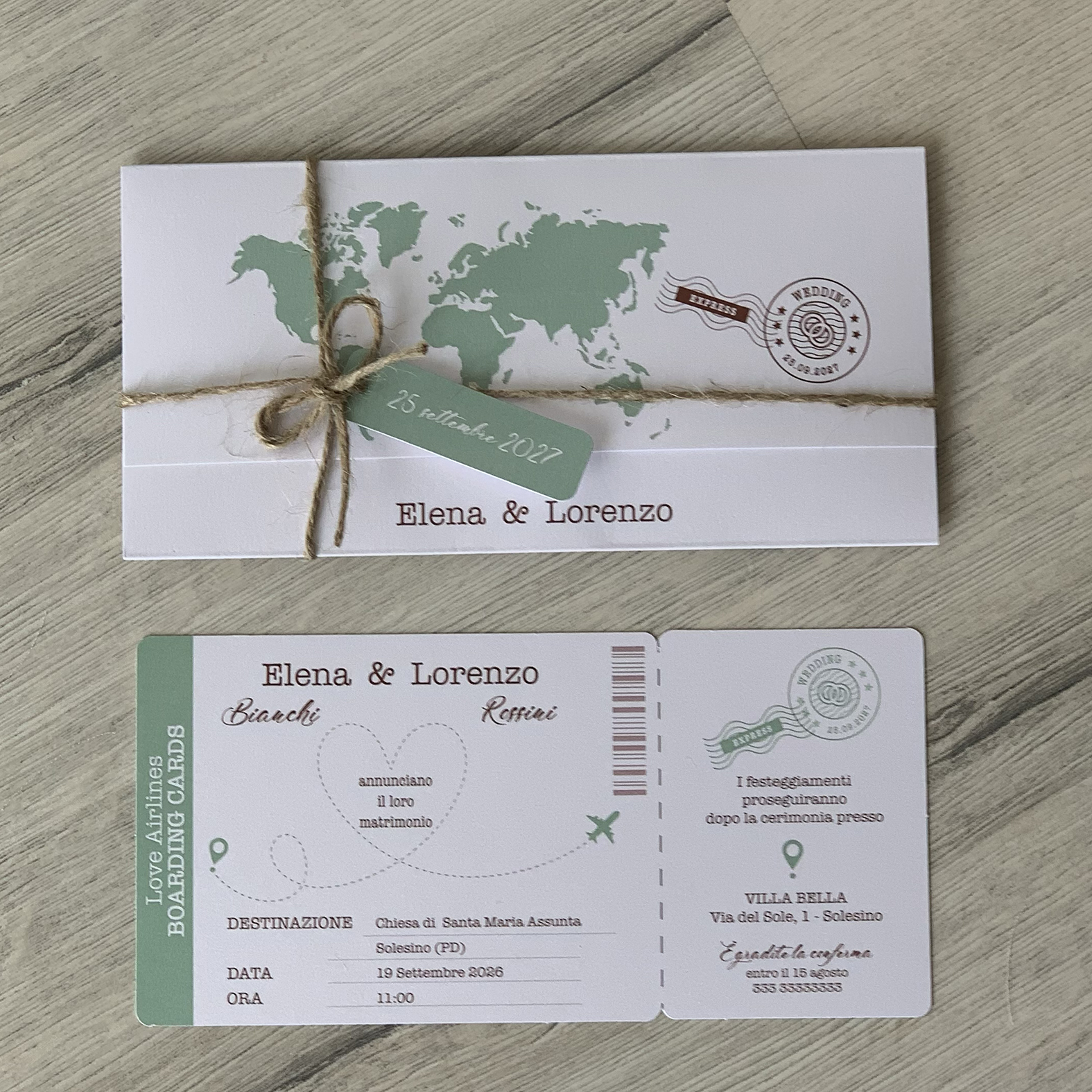 Annuncio moderno realizzato in cartoncino perlato con stampa del planisfero, chiuso con cordoncino e tag con i nomi. All'interno biglietto contenente tutti i dati del matrimonio.
