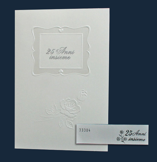 | Caratteristiche del materiale: | Cartoncino avorio con rose a rilievo e scritta in argento "25 anni insieme". |