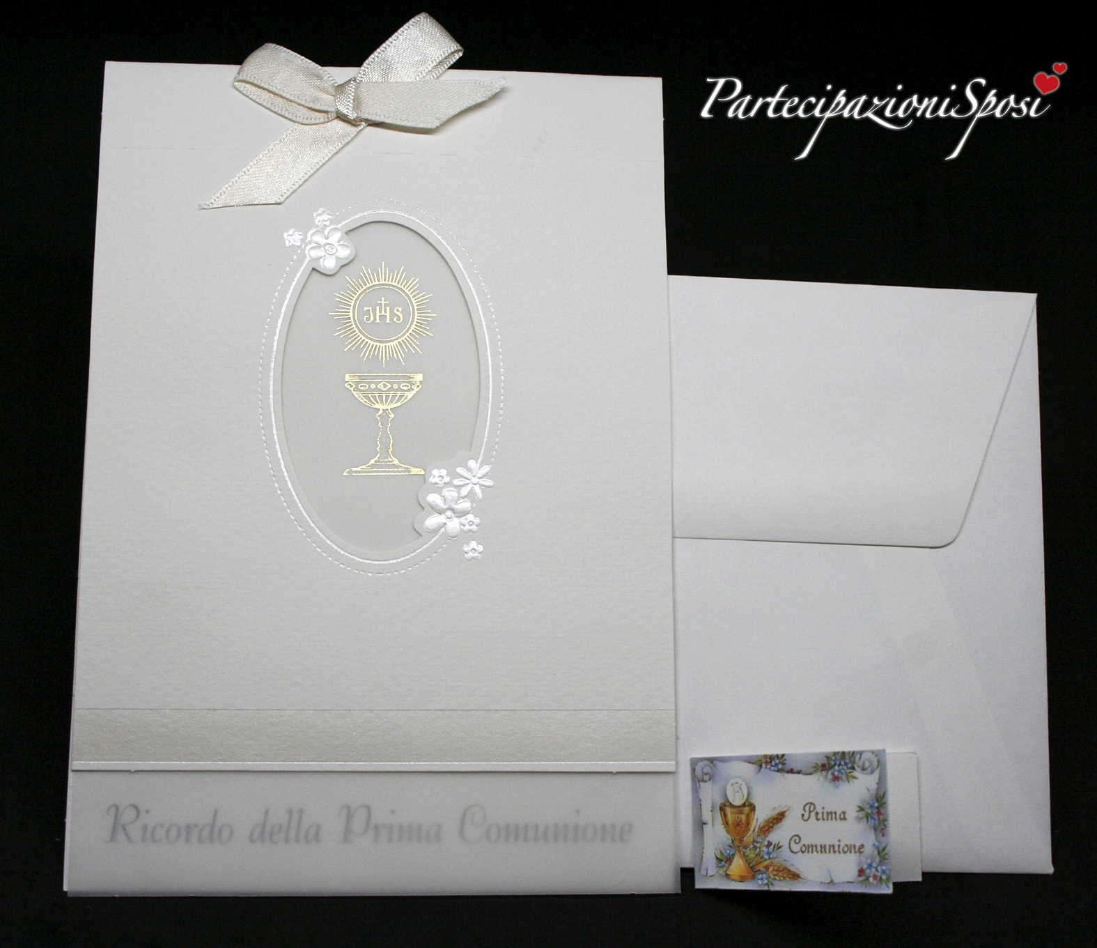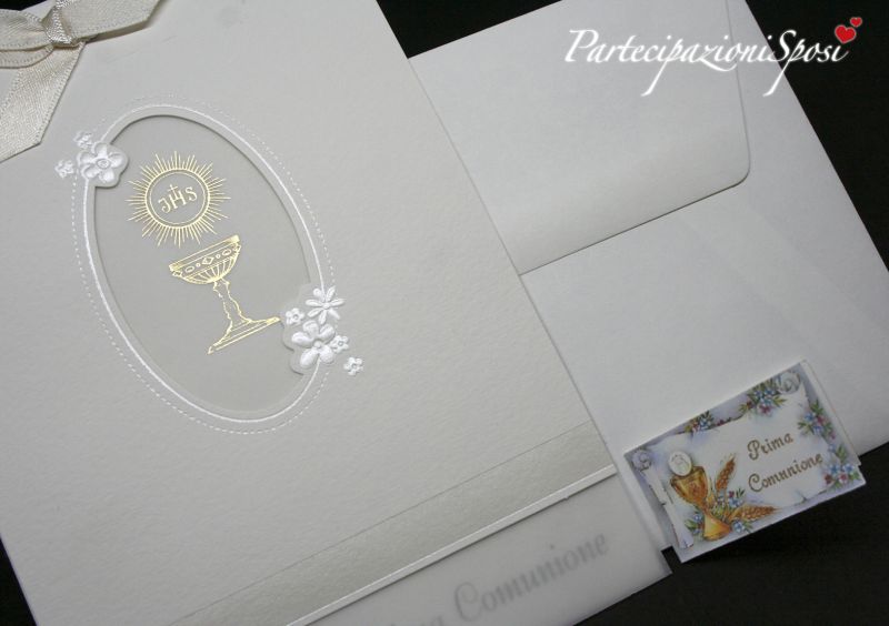Elegante e raffinato biglietto per la Prima comunione realizzato in cartoncino martellato bianco non candido con particolari in rilievo e lamina perlata. All'interno Viene legata con unastro di raso tinta burro, una velina con stampato in oro a caldo il simbolo del calice.