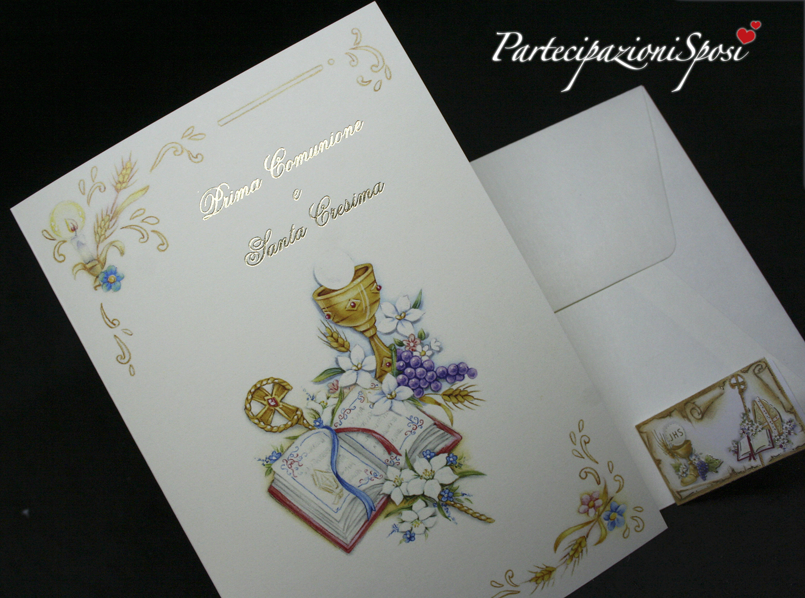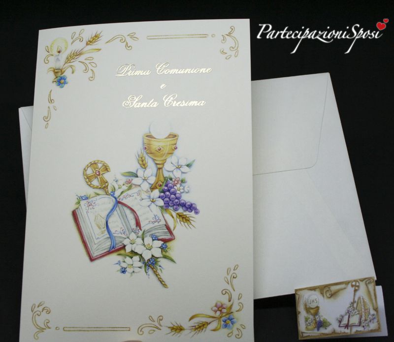 | Caratteristiche del materiale: | Biglietti per la Prima Comunione e Santa Cresima efettuate nello stesso giorno. Il cartoncino utilizzato è avorio con stampa che richiama entrambe le cerimonie e particolari in oro a caldo. All'interno si può stampare sia il Ricordo della Prima Comunione e Santa Cresima, che l'invito alla cerimonia e ai festeggiamenti. Le buste avorio coordinate sono comprese nel prezzo dei biglietti. Anche i bigliettini per le bomboniere contengono le immagini sia di Prima Comunione che di Santa Cresima insieme. |