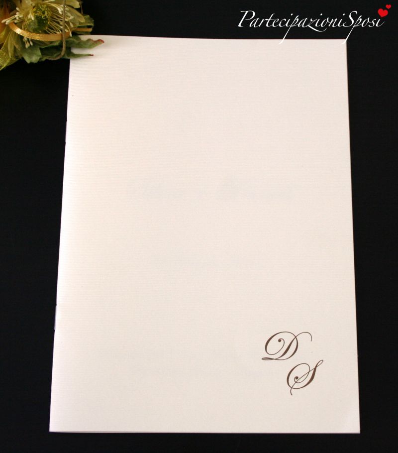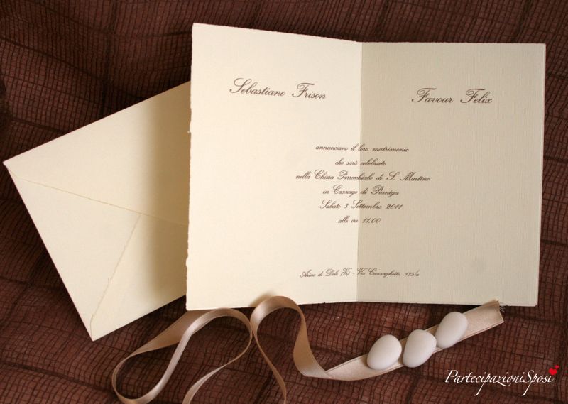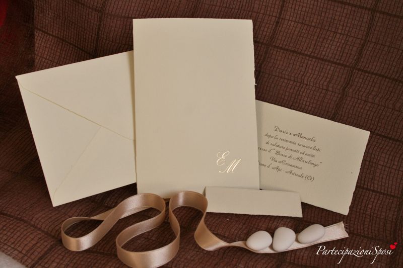 Partecipazione classica in cartoncino millerighe con taglio irregolare di colore crema. Il formato è a libro in verticale ma la stampa può essere ruotata per renderle in formato libro in orizzontale. In questo caso il testo verrà stampata nel lato in basso. Generamente per arricchire questa partecipazione vengono aggiunte sulla prima facciata le iniziali degli sposi. Si possono avere varie opzioni di iniziali: stampate (stesso carattere e colore del resto del testo), in rilievo a secco (le classiche iniziali per eccelelnza), oppure in oro argento a caldo (ancora più preziose).