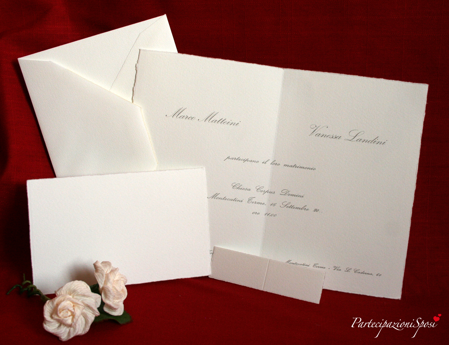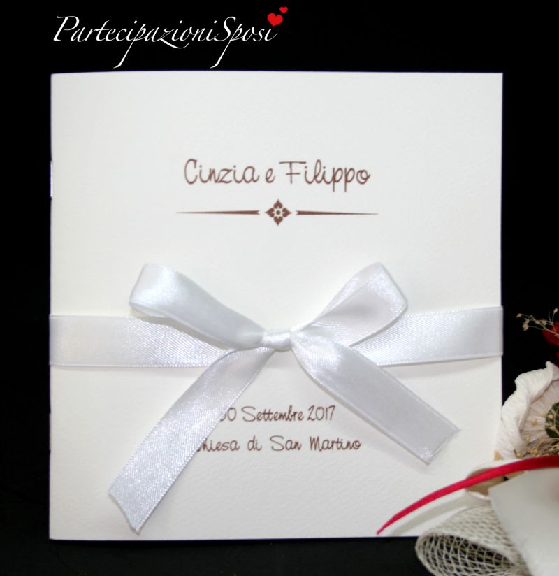 Partecipazione classica in cartoncino liscio di colore bianco non candido con bordi dal taglio irregolare. Il formato è a libro in verticale ma la stampa può essere ruotata per renderle in formato libro in orizzontale. In questo caso il testo verrà stampate nel lato in basso. Generamente per arricchire questa partecipazione vengono aggiunte sulla prima facciata le iniziali degli sposi. Si possono avere varie opzioni di iniziali: stampate (stesso carattere e colore del resto del testo), in rilievo a secco (le classiche iniziali per eccelelnza), oppure in oro argento a caldo (ancora più preziose).
