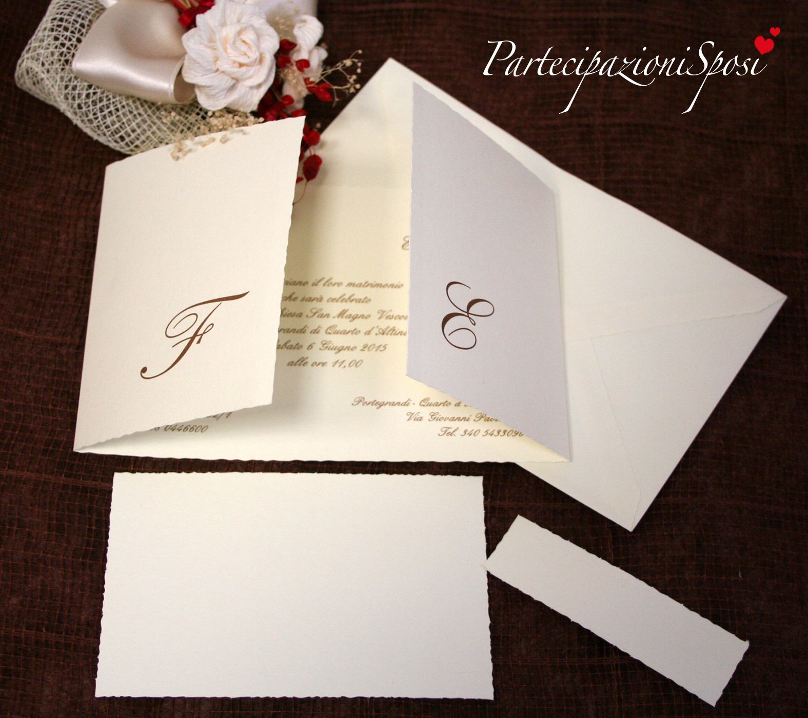 Partecipazione classica in cartoncino liscio di colore crema con bordi dal taglio lavorato aondine. Il formato è in orizzontale con due ante che si aprono una a verso destra e l'altra verso sinistra. Generamente per arricchire questa partecipazione vengono aggiunte sulla due ante le iniziali degli sposi. Una su quella di destra e l'altra su quella di sinistra. Si possono avere varie opzioni di iniziali: stampate (stesso carattere e colore del resto del testo), in rilievo a secco (le classiche iniziali per eccelelnza), oppure in oro argento a caldo (ancora più preziose).