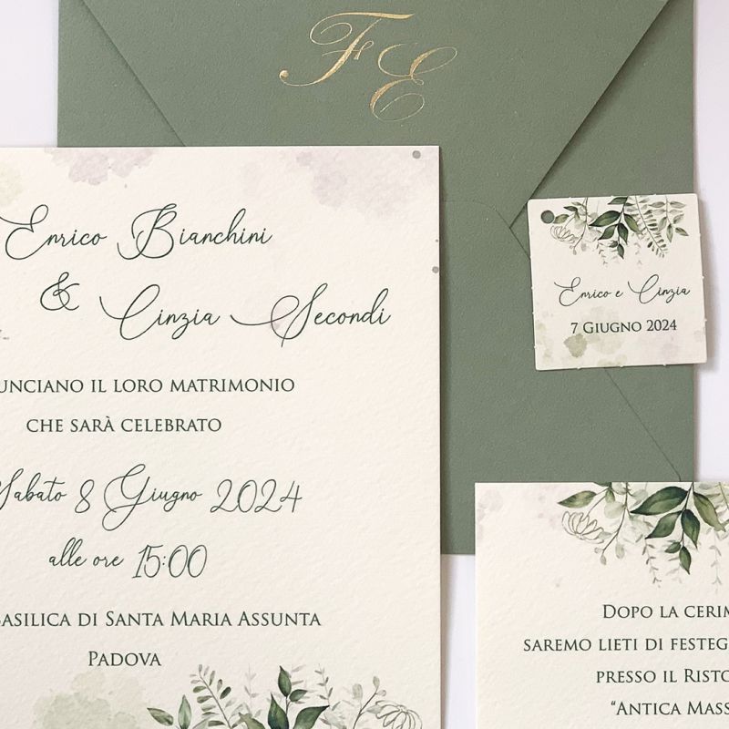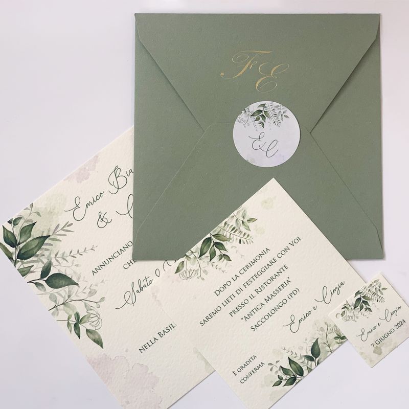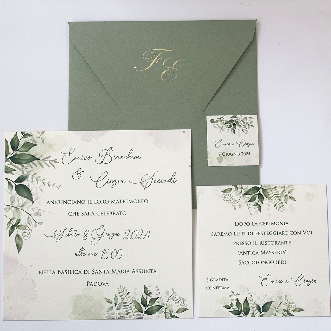 | Caratteristiche del materiale: | Cartoncino martellato avorio da 260 gr Busta Naturale color verde salvia. Si può avere anche in color avana oppure carta martellata avorio. Con questa grafica possiamo realizzare: TAG per bomboniere o sacchettini, scatoline portaconfetti, libretti cerimonia, porta fazzoletti per le lacrime di gioia, menù, segnaposto, tableau de mariage, ventagli in cartoncino, fascette per stelle scintillanti. Si possono impreziosire con iniziali in oro a caldo, in rilievo o con ceralacca. Quantità minima acquistabile 30 PEZZI COSTO STAMPA SEMPRE COMPRESO |