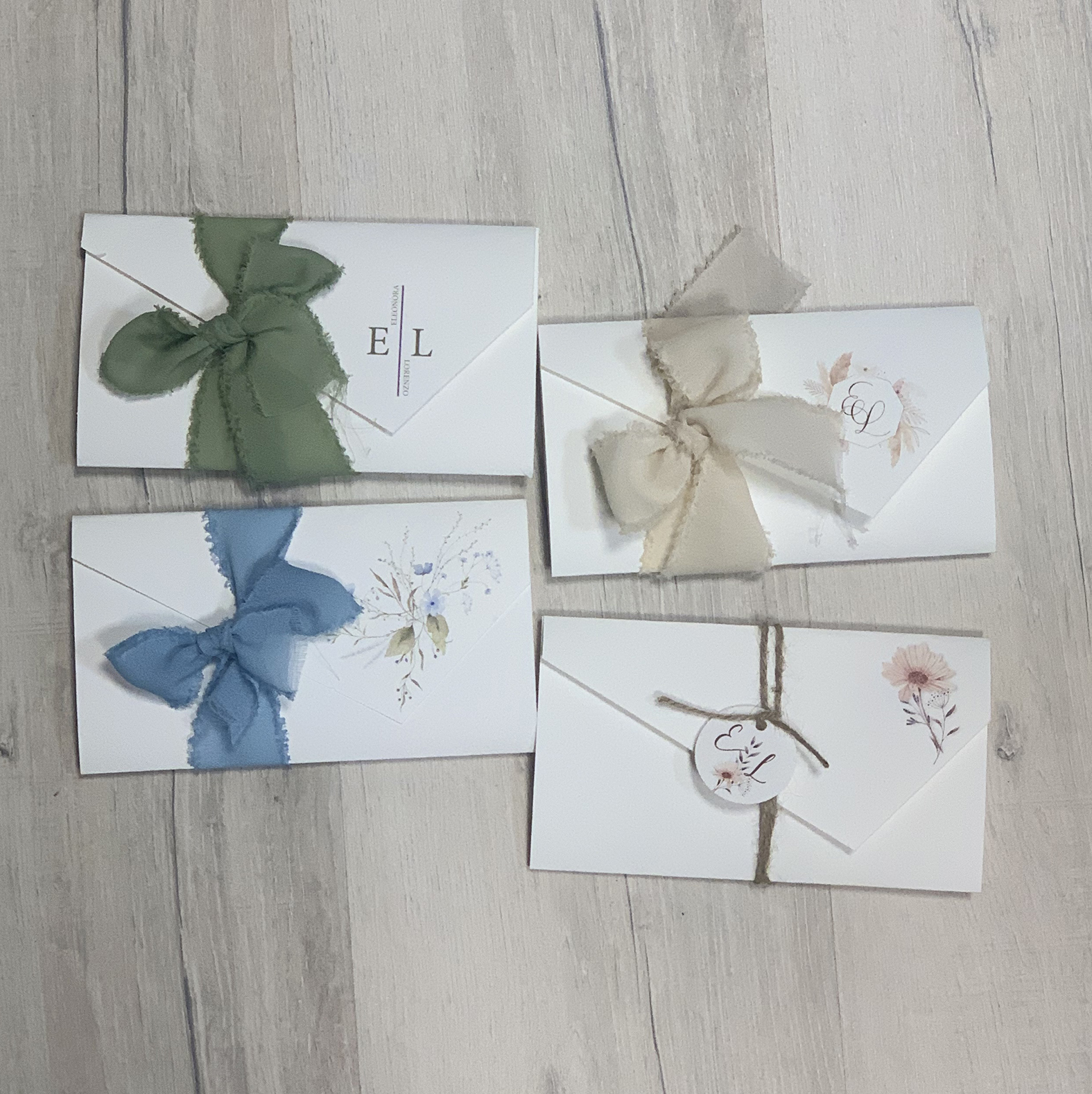 Moderni inviti di nozze realizzati in un unico cartoncino con tutti i dati stampati. Atticchiti con nastri in seta sfrangiata o con cordoncini e tag con iniziali.