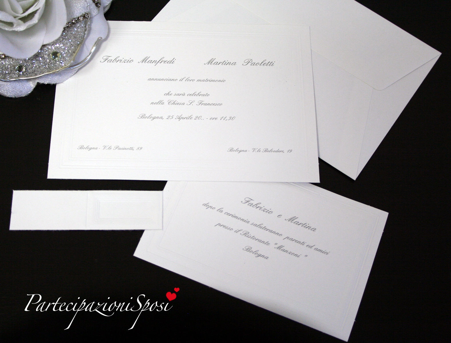 Annuncio di nozze in cartoncino color bianco non candido molto spesso, la forma è tipo cartolina. Ad arricchiere e distinguere questi inviti di nozze è la lovarazione in rilievo dei lati in rilievo a secco tipo cornice di un quadro. Sugli annunci vanno stampati tutti i dati riguardanti la cerimonia quindi nome e cognome degli sposi, data, ora e luogo della cerimonia.