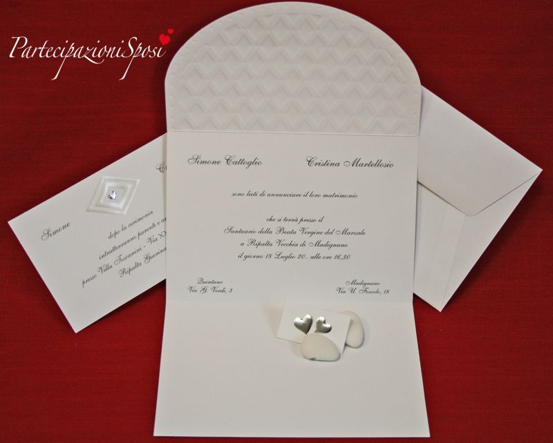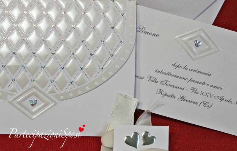 Partecipazione di nozze in cartoncino bianco con lavorazioni a rilievo in madreperla e argento.