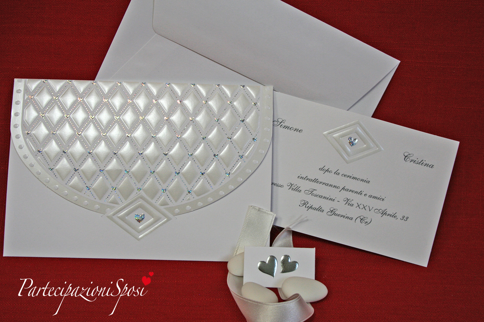 Invito coordinato con decori in madreperla e argento.
