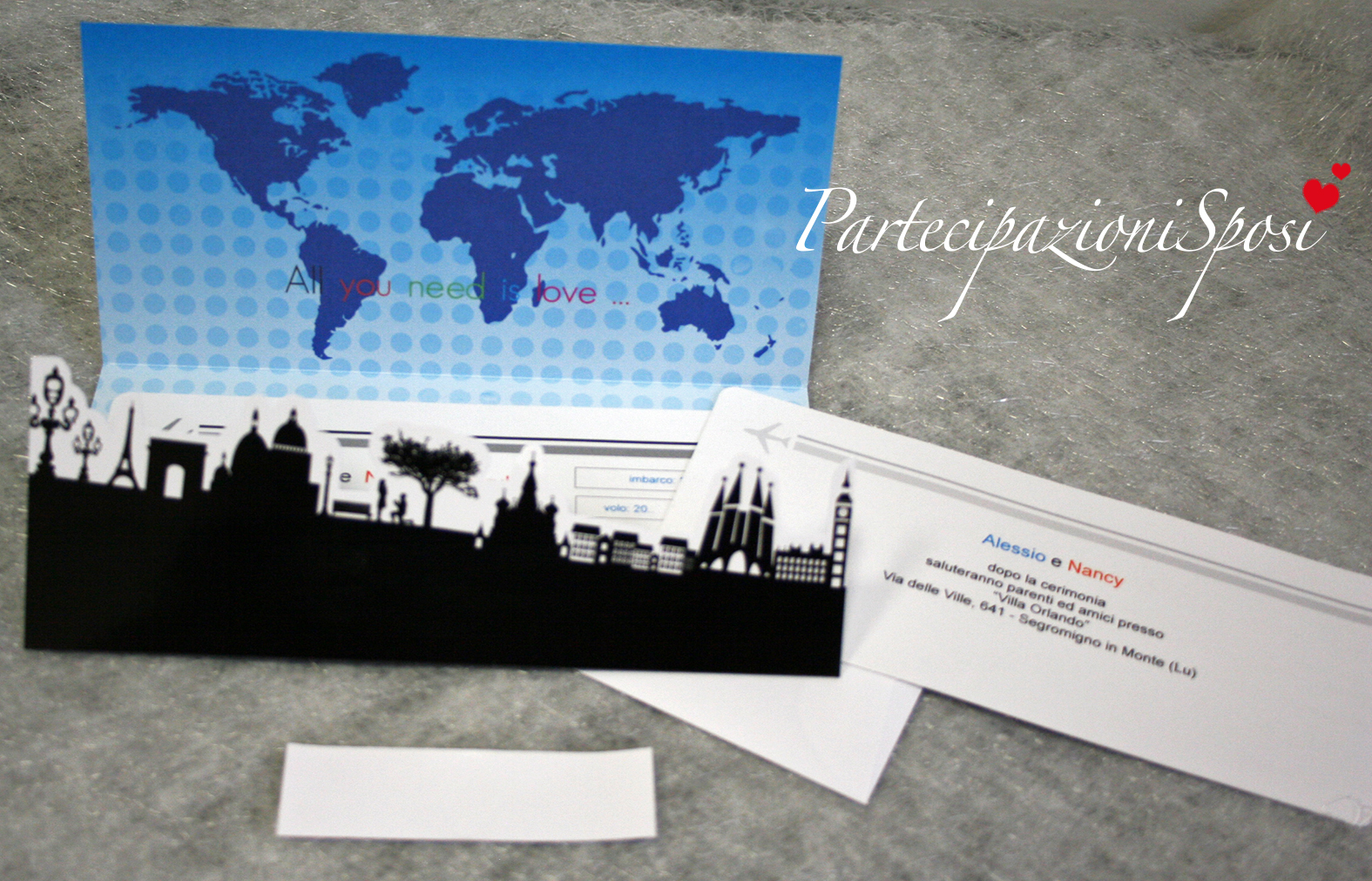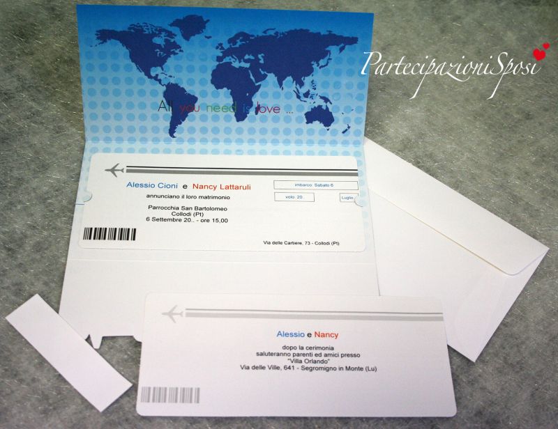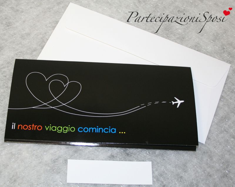All'interno cartoncino tipo biglietto aereo da personalizzare. Invito coordinato compreso nel prezzo.