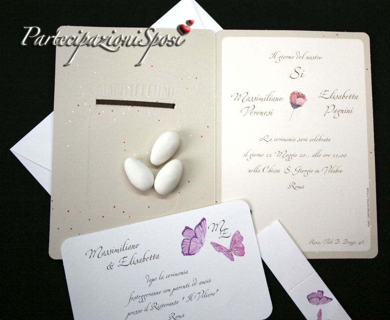 L'invito dove scrivere l alocation dei festeggiamenti dopo la cerimonia, è in cartoncino bianco con due farfalle stampate, ed è compreso nel prezzo dell'annuncio. Indicare sempre la quantità degli inviti per poter inserire il testo.