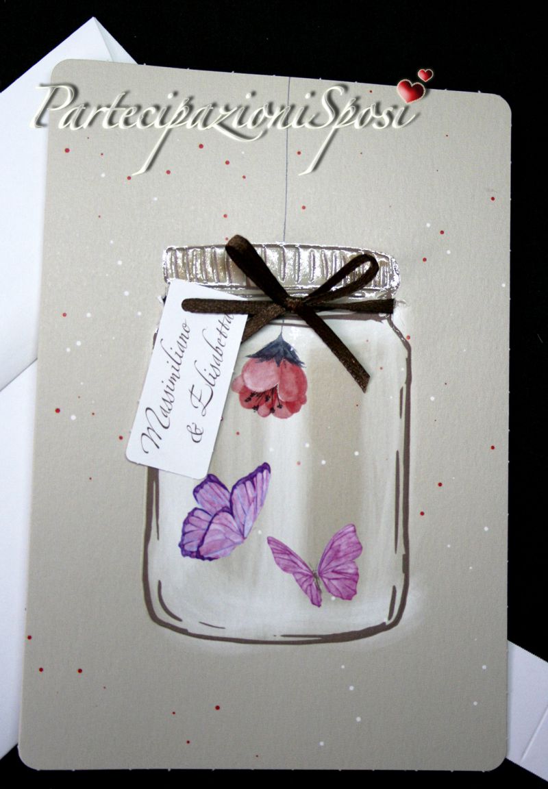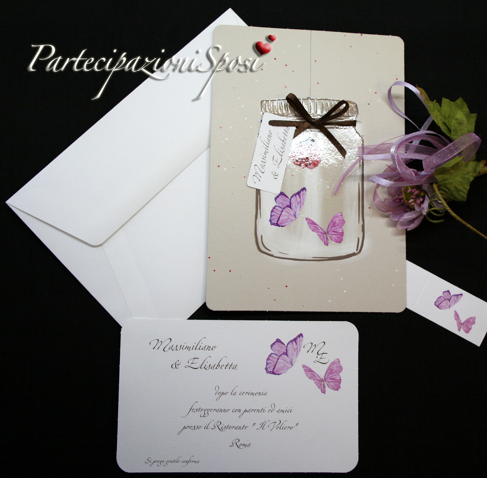 L'annuncio ha la parte frontale con stampato un barattolo con due farfalle e un fiore, legato al collo del barattolo un nastrino in colore marrone contenente un tag con stampati i nomi degli sposi. La pagina è arricchita da particolori in rilievo lucido.