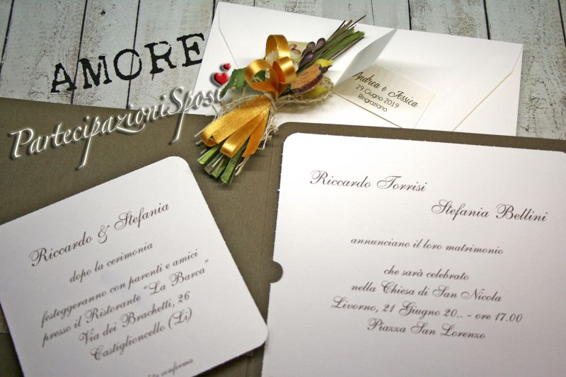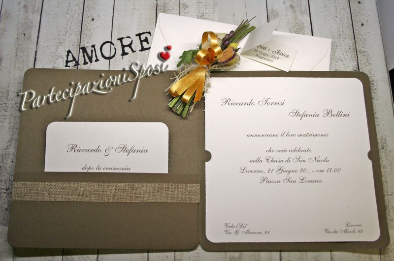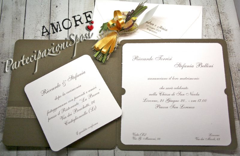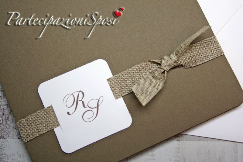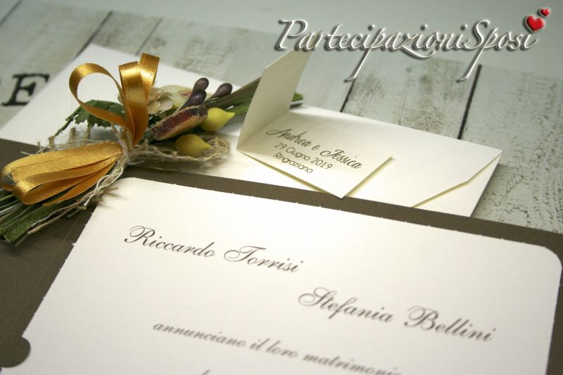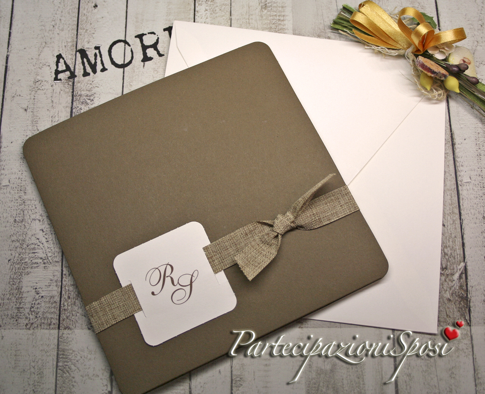 All'interno vengono custoditi sia l'annuncio dove si riportano i nomi, la data e il luogo della cerimonia, che l'invito ai festeggiamenti. Il cartoncino usato è avorio. A completare e abbellire l'annuncio un nastro frezzo di colore marrone melange dove viene applicato tag con le iniziali dei futuri sposi.