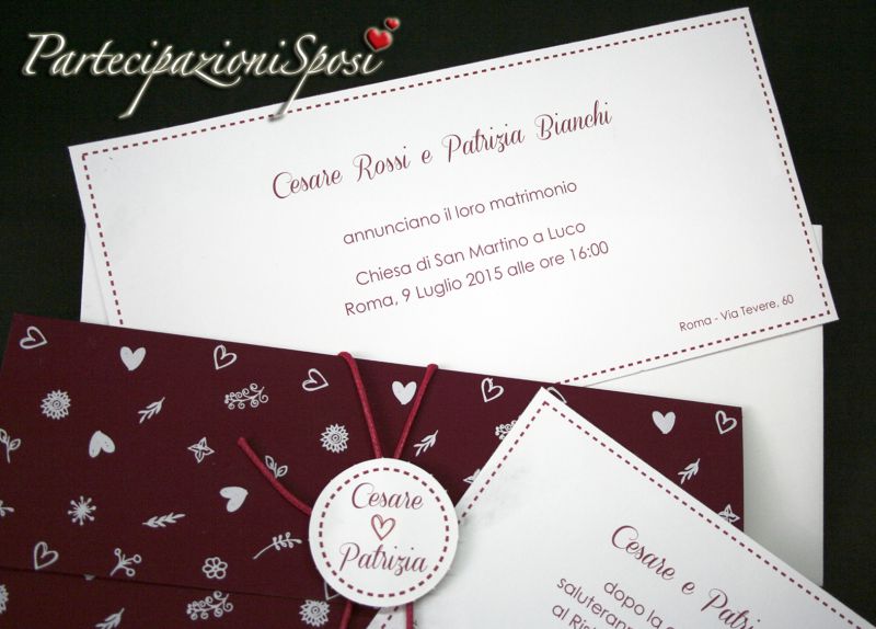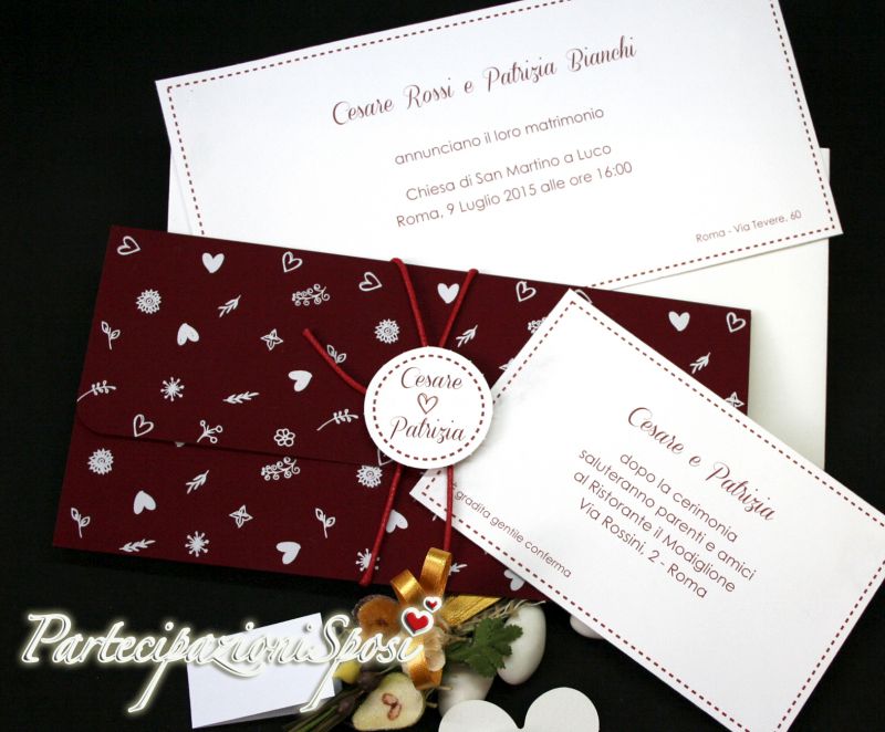 La custodia è in cartoncino "soft touch" con decori in bianco opaco. A chiudere la custodia un cordoncino di colore rosso sul quale è attaccatto un tag con i nomi degli sposi. All'interno vengon custoditi sia l'annuncio che l'invito. Entrambi in cartoncino bianco con greca rossa. Sull'annuncio o partecipazione, vanno stampati i dati riguardanti la cerimonia, la data e l'ora. Sull'invito si scrive dove si andrà a festeggiare.