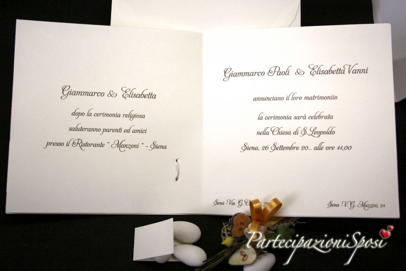 All'interno vengono stampati sia l'annuncio dove si riportano i nomi, la data e il luogo della cerimonia, che l'invito ai festeggiamenti. L'annuncio viene stampato a destra, l'invito a sinistra.