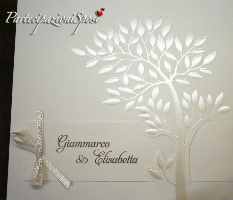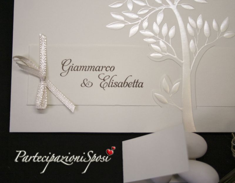 La copertina è in cartoncino avorio con albnero in rilievo e in madreperla. Legato con nastrino di raso avorio, cartoncino con i nomi degli sposi.