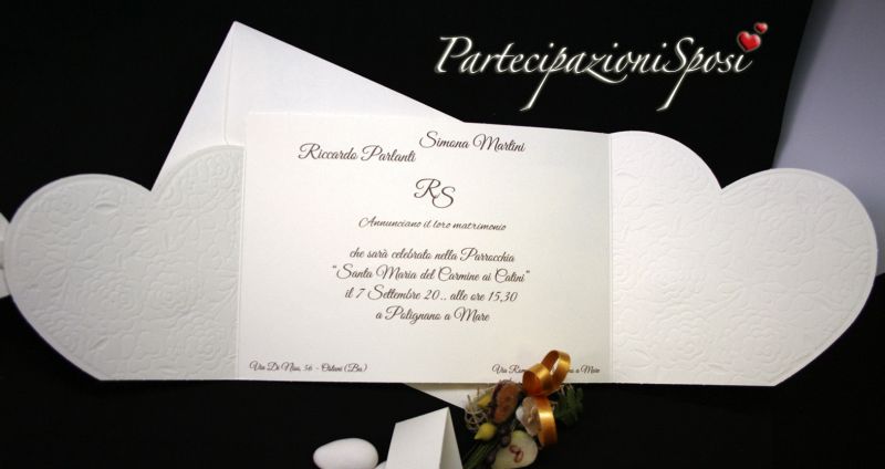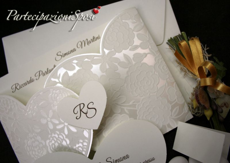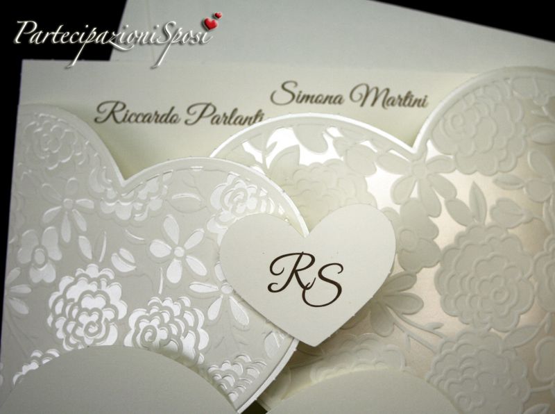 Annunci di nozze romantici. La partecipazione è in cartoncino avorio con decori in rilievo e madreperla. A chiuderla cuore con le iniziali stampate (possono essere fatte anche in oro o argento a caldo). All'interno della partecipazione andranno stampati i dati riguardanti la cerimonia quindi data, ora e luogo nonché i nomi degli sposi ed eventualmente i loro indirizzi.