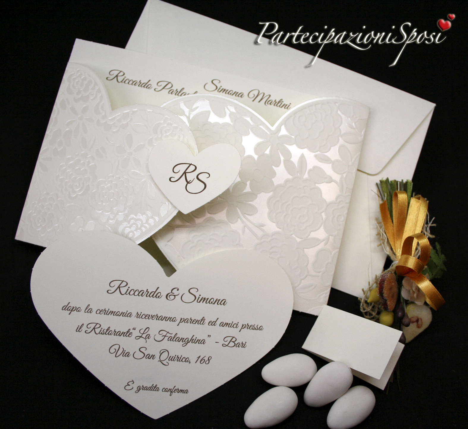 | Caratteristiche del materiale: | Annunci di nozze romantici. La partecipazione è in cartoncino avorio con decori in rilievo e madreperla. A chiuderla cuore con le iniziali stampate (possono essere fatte anche in oro o argento a caldo). All'interno della partecipazione andranno stampati i dati riguardanti la cerimonia quindi data, ora e luogo nonché i nomi degli sposi ed eventualmente i loro indirizzi. Questa partecipazione ha un romantico invito a forma di cuore compreso nel prezzo. L'invito è compreso nel prezzo di ogni partecipazione ordinata. Indicare sempre la quantità degli inviti per poter inserire il testo. Ad ogni partecipazione corrisponde 1 biglietto invito. Per la lista nozze o IBAN verrà stampato un cartoncino aggiuntivo. I bigliettini per le bomboniere o confetti sono in cartoncino avorio. Le buste avorio coordinate sono comprese nel prezzo. |