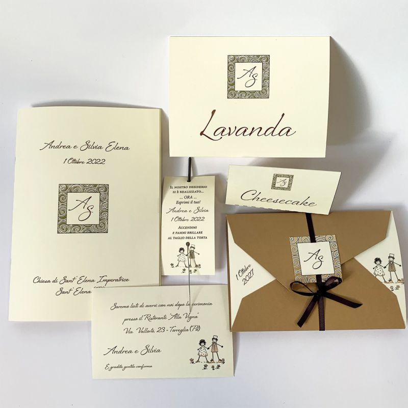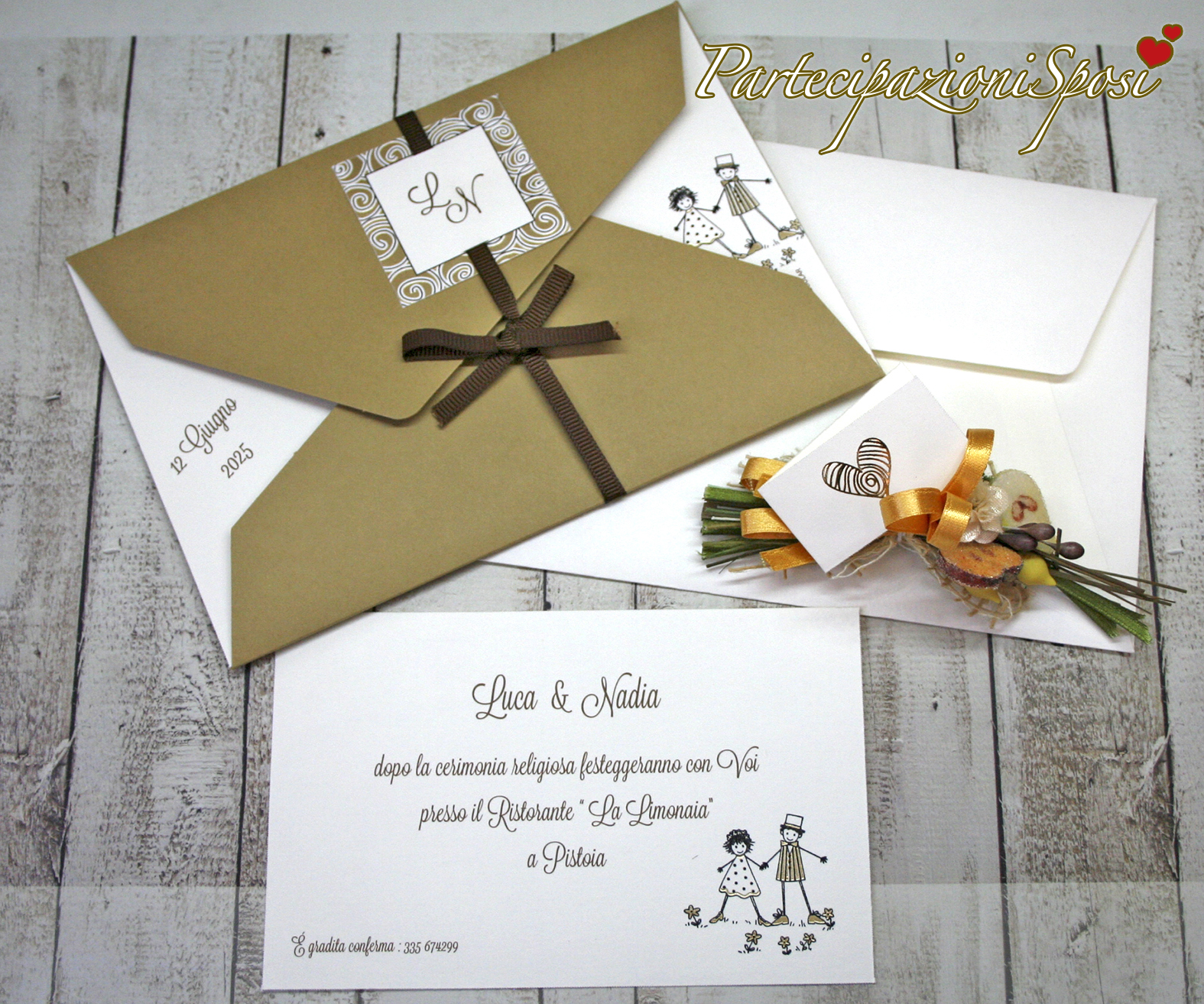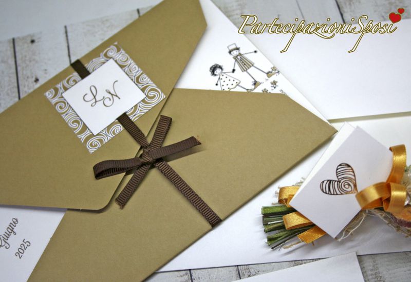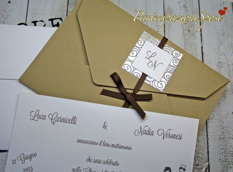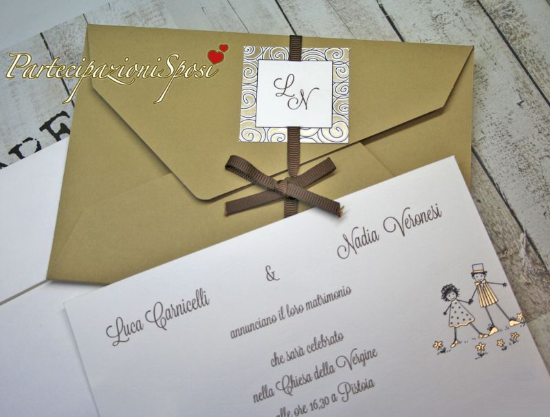 All'interno viene custodito l'annuncio dove si riportano i nomi, la data e il luogo della cerimonia. questo cartoncino di colore avorio ha sul lato destro una stampa in nero e oro a caldo, di due sposini stilizzati che si tengono per mano. A completare e rendere più prezioso il tutto, un tag quadrato dove vengobno stampate le iniziali dei nomi dei futuri sposi (iniziali che possono essere stampate in litografia oppure impresse in oro a caldo o per finire in rilievo a secco) legato con un nastrino in gross grain marrone scuro che da un bell'effetto di contrasto con il cartoncino.