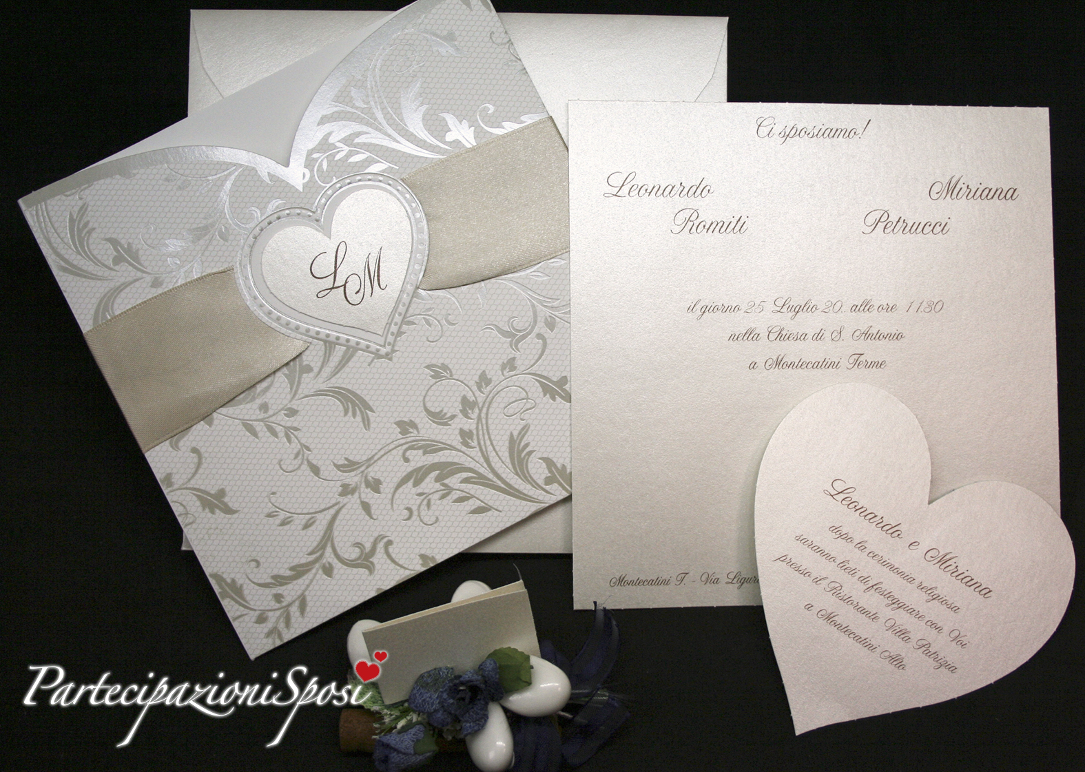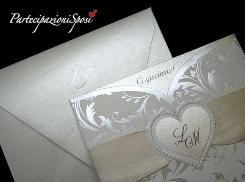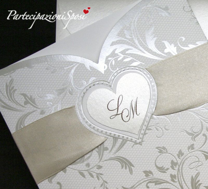 La partecipazione è formata da una custodia quadrata con stampa a caldo di particolari tipo pizzo. Al centro è realizzato un cuore con intaglio laterale per far passare un nastro di raso beige alto 4 cm. Sul cuore vine posto un cuoricino realizzato in cartoncino perlato sul quale possono essere stampate le iniziali degli sposi. All'interno della custodia è inserito un cartoncino perlato avorio dove andranno stampati tutti i dati riguardanti la cerimonia: nomi degli sposi, luogo, data e ora; a discrezione degli sposi potranno essere anche stampati i loro indirizzi.