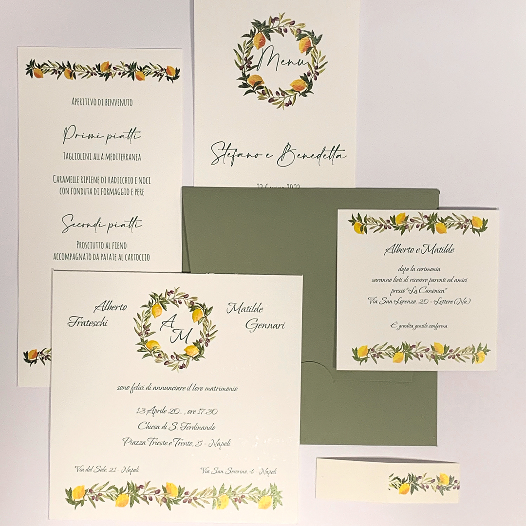 Partecipazioni a tema limoni con una particolare busta verde salvia in carta naturale.