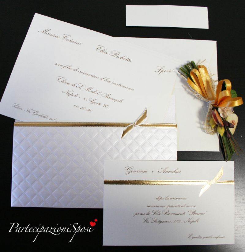 Annuncio composto da custodia in cartoncino madreperla con lavorazioni in rilievo e in oro a caldo. All'interno cartoncino avorio con lavorazione in rilievo da stampare.