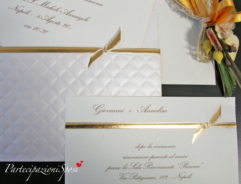 Invito in cartoncino avorio con particolare in oro a caldo.