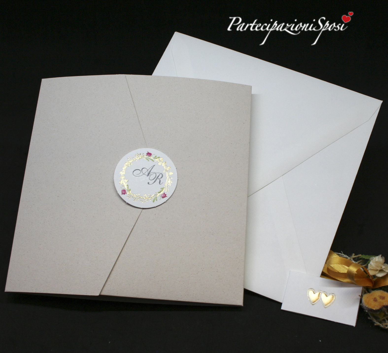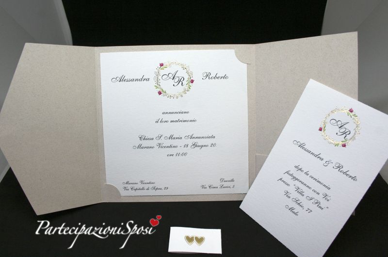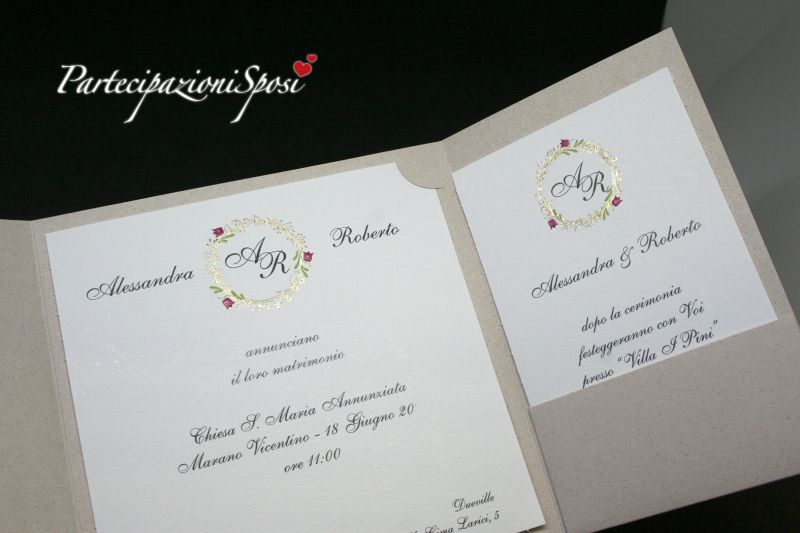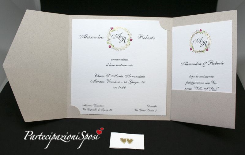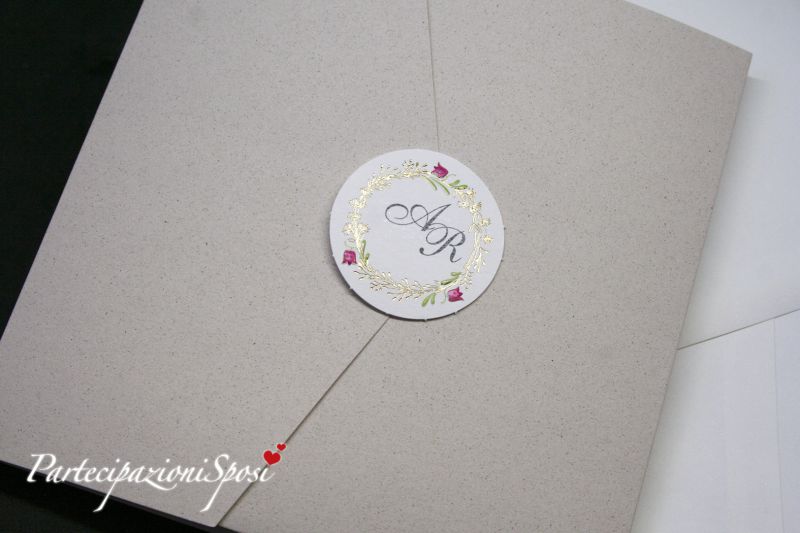 La custodia è in cartoncino pesante da 300 gr in tinta tortora marmo che si apre ad ante e su quella centrale ha l'intaglio per inserire il cartoncino annuncio, con stampati tutti i dati della cerimonia; questo cartoncino bianco sul centro riporta lo stesso tema del tag frontale, ossia la ghirlanda in oro a caldo con i tulipani fuxia; sulla destra c'è una tasca per inserire l'invito ai festeggiamenti o la lista nozza oppure l'invito al taglio della torta o un cartoncino save the date. Anche questo cartoncino ha lo stesso tema conduttore che è la ghirlanda con i tulipani.