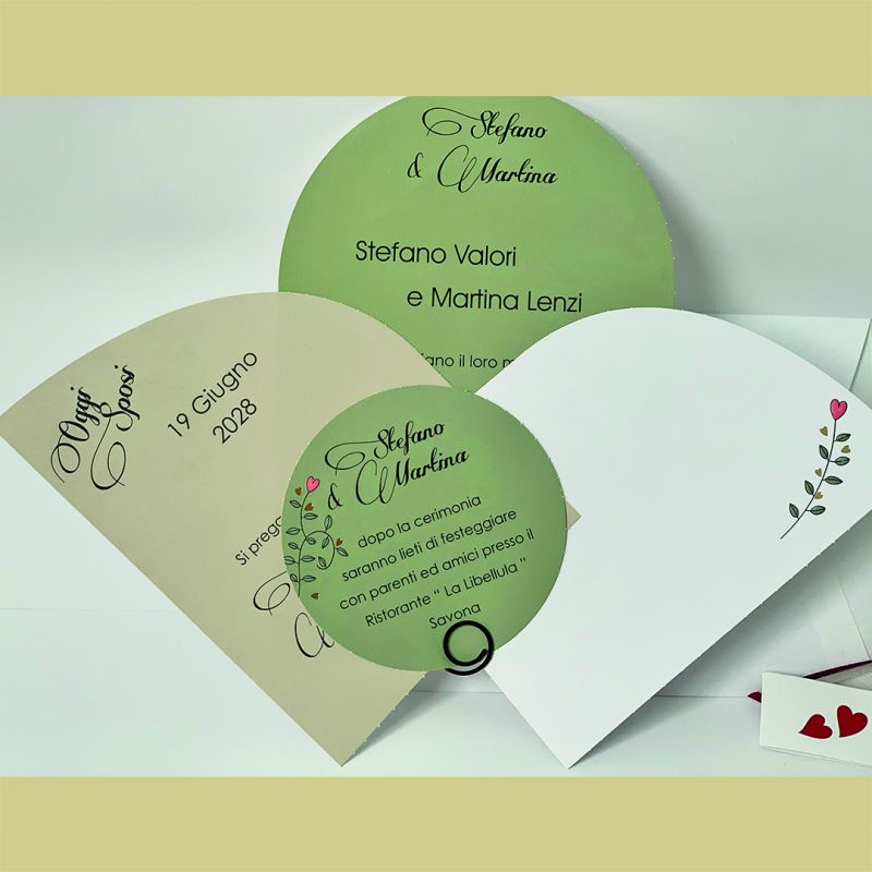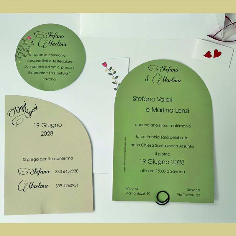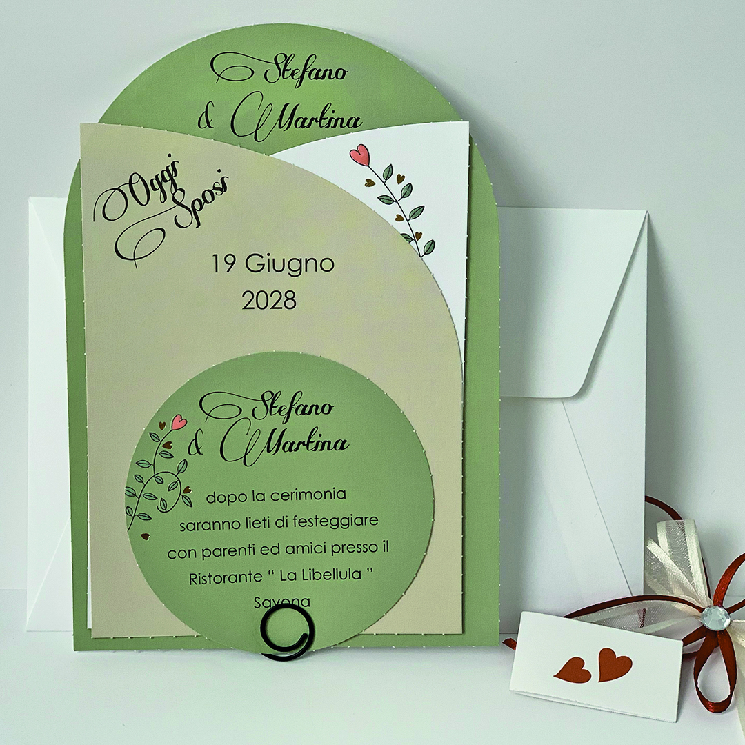 | Caratteristiche del materiale: | Nuove idee di inviti nozze formate da vari cartoncini che possono contenere tutte le informazioni necessarie a comunicare in modo moderno il proprio evento. I colori sono neutri con base verde salvia, tortora e bianco. I vari cartoncini vengono tenuti insieme da una graffetta in formato particolare a spirare di colore nero. Le buste coordinate e comprese nel costo, son bianche. Per colori diversi, chidere il preventivo. |