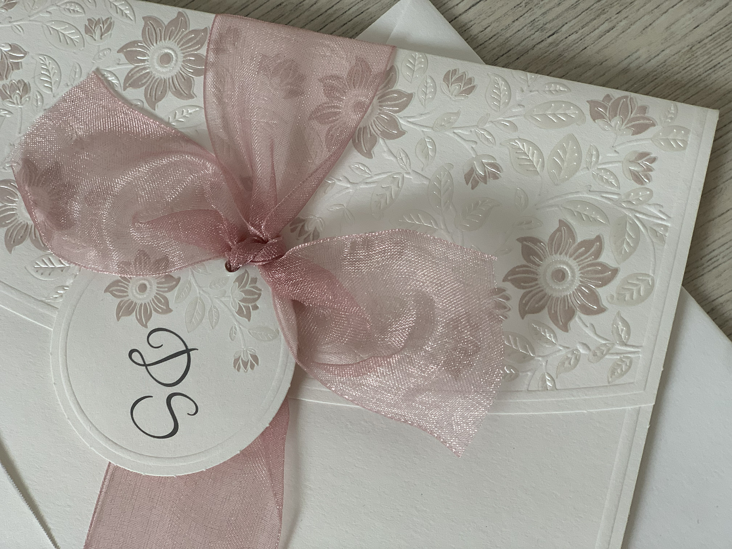 L'annuncio o partecipazione è composto da una custodia in cartoncino lavorato con fiori e foglie in rilievo e bianco e rosa antico perlato. Questo custodia conterrà il cartoncino per l'annuncio e quello per l'invito. La chiusura è composta da un nastro di organza di colore rosa antico con un tag tondo con le iniziali.