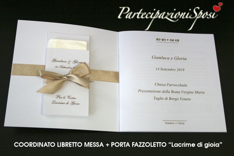 In coordinato all'annuncio, libretto cerimonia e gli originali portafazzolettini di carta per le "lacrime di gioia"