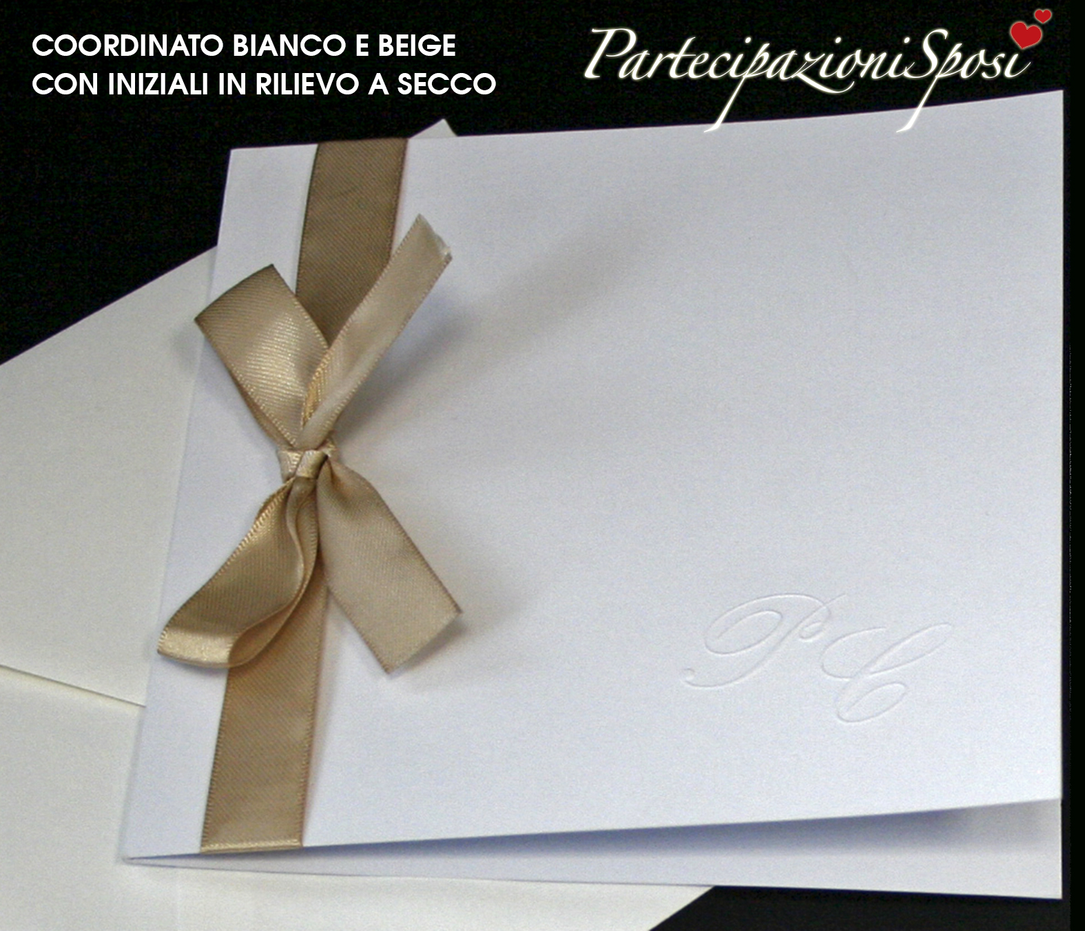 Formato quadrato impreziosito da iniziali in rilievo a secco e nastro beige. (a richiesta anche altri colori).