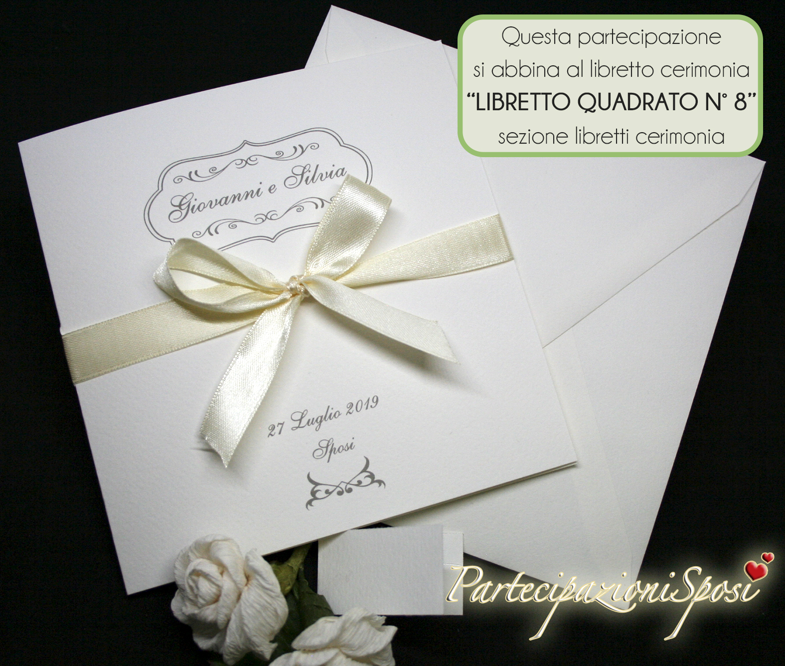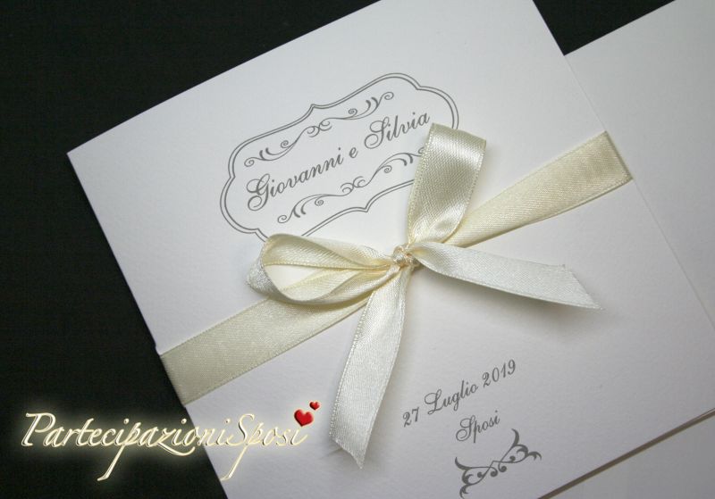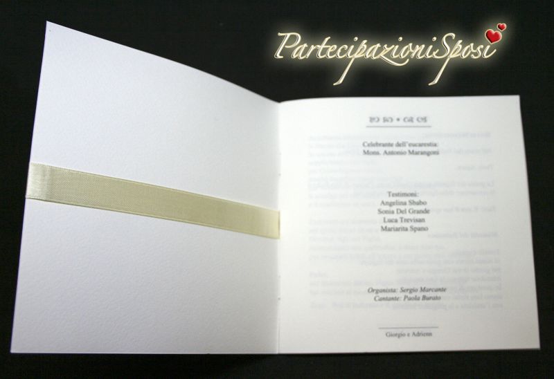 Formato quadrato stampato sia all'interno che all'esterno e arricchito da nastro avorio. (a richiesta anche altri colori).