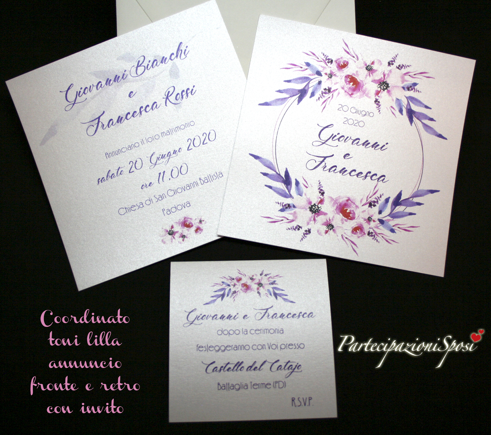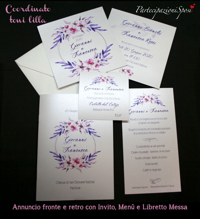 Il materiale usato in questo coordinato è cartoncino bianco con effetto "madreperla". Disegni floreali moderni che possono accompagnare ogni particolare dell'intera cerimonia dall'annuncio al libretto cerimonia, al menu e biglietti per la confettata.