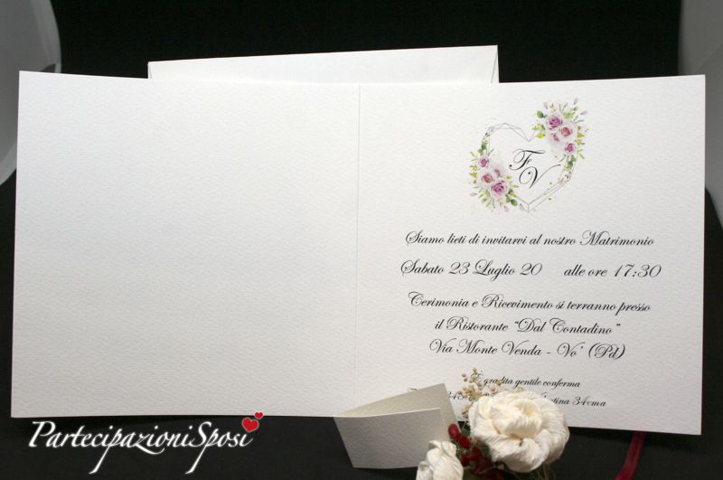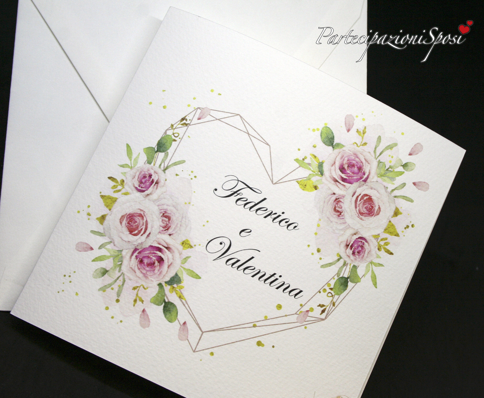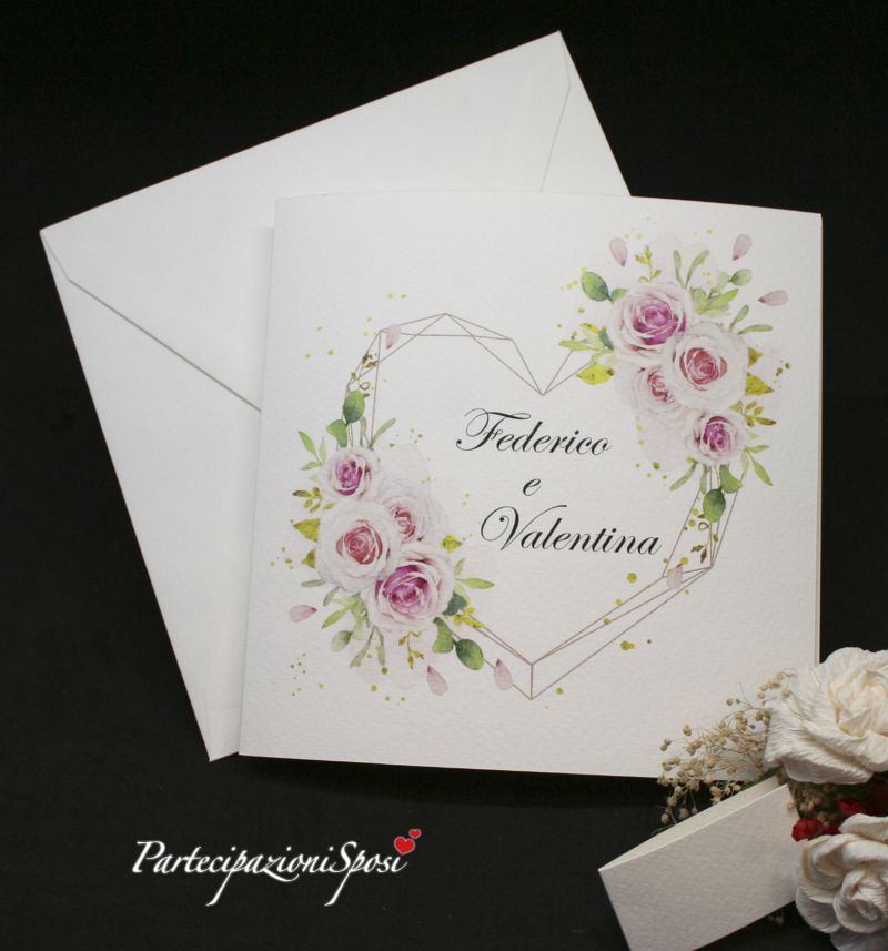 Annunci di nozze dall'impronta moderna e romantica realizzato in cartoncino bianco ruvido di forma quadrata a tema di rose con cuore stilizzato dove inserire i nomi.