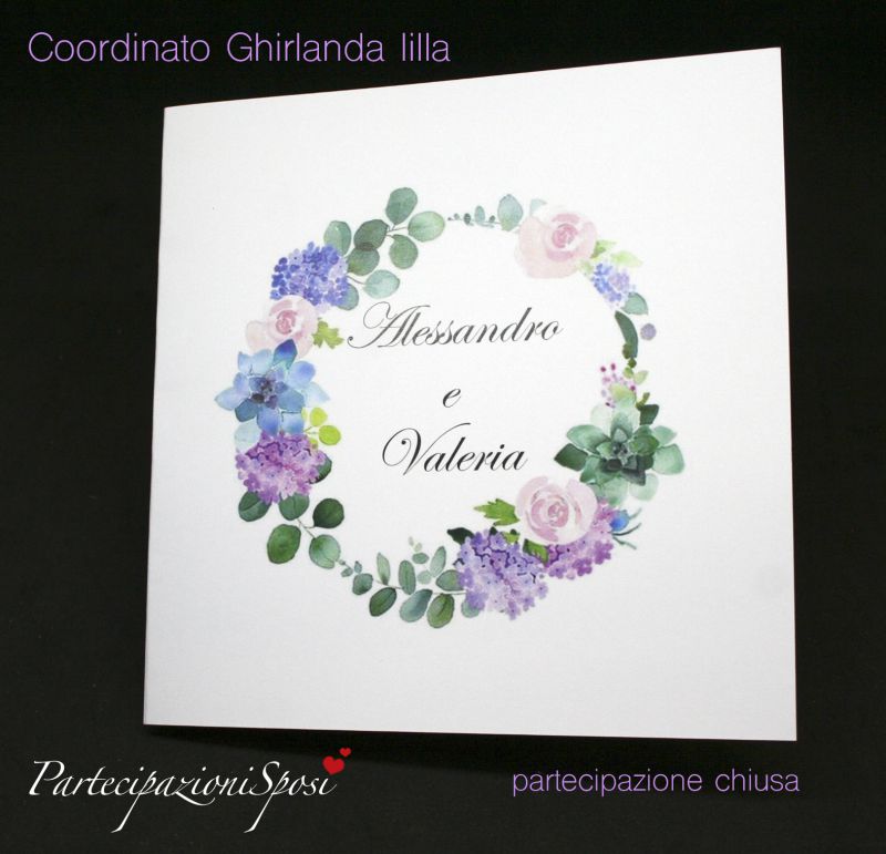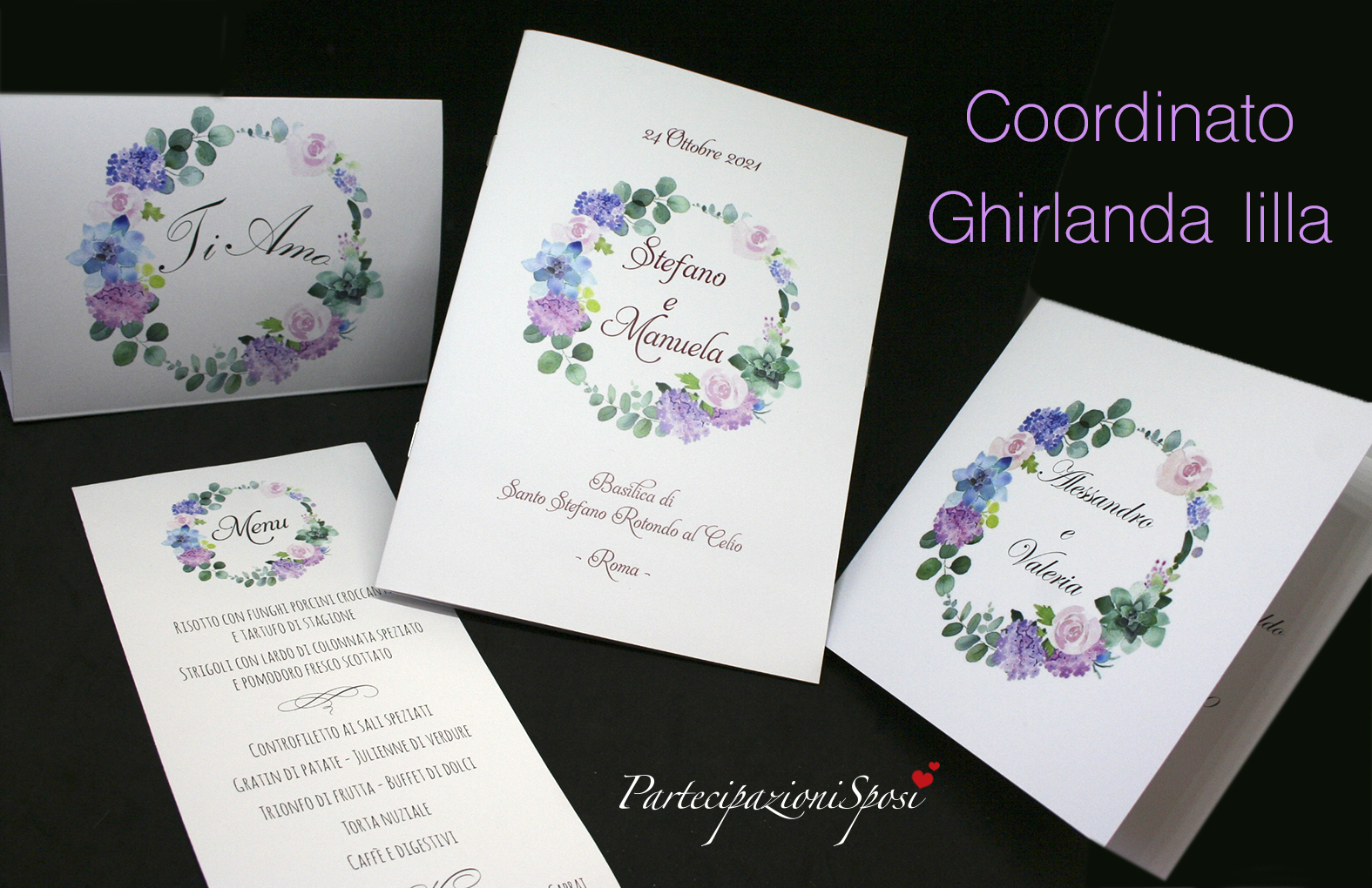 In questo coordinato possiamo realizzare anche libretti per la cerimonia, tableau de mariage, segnatavolo o segnaposto e menu tutti con il tema ghirlanda di fiori lilla. Per un preventivo del set completo contattateci.