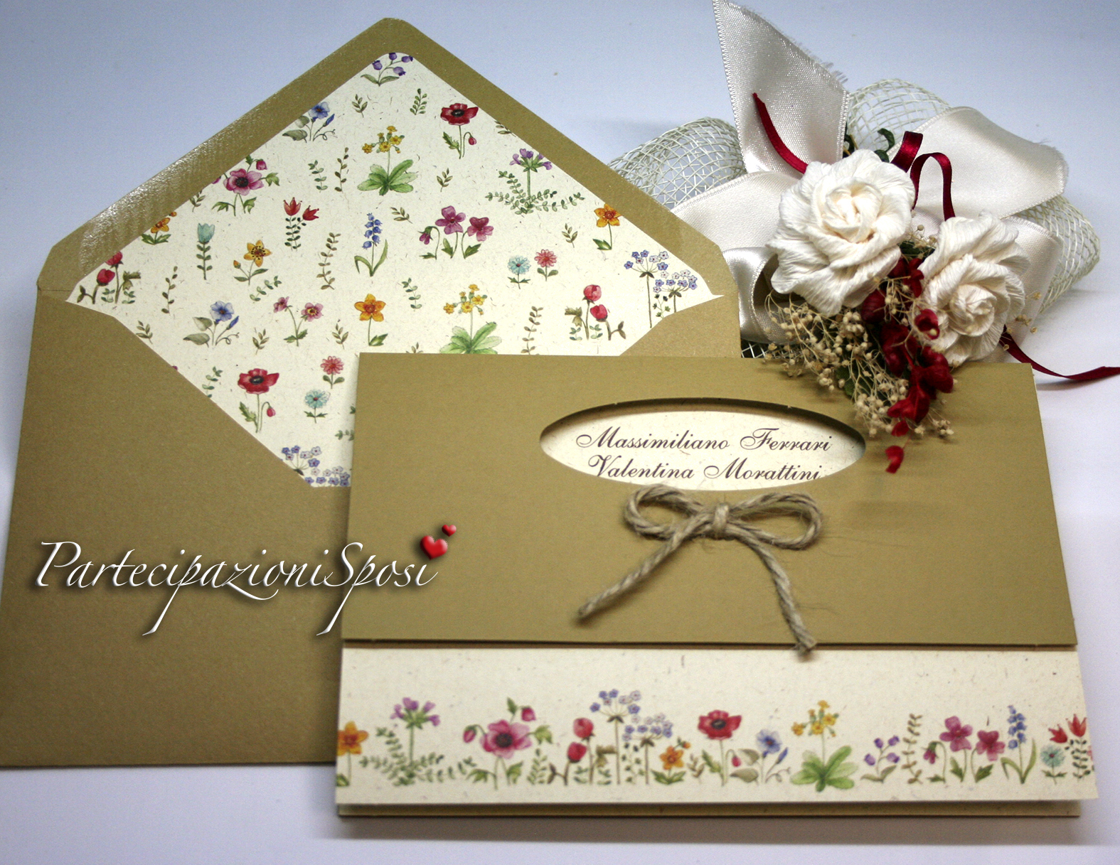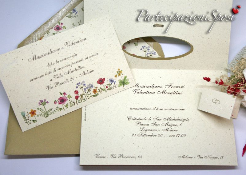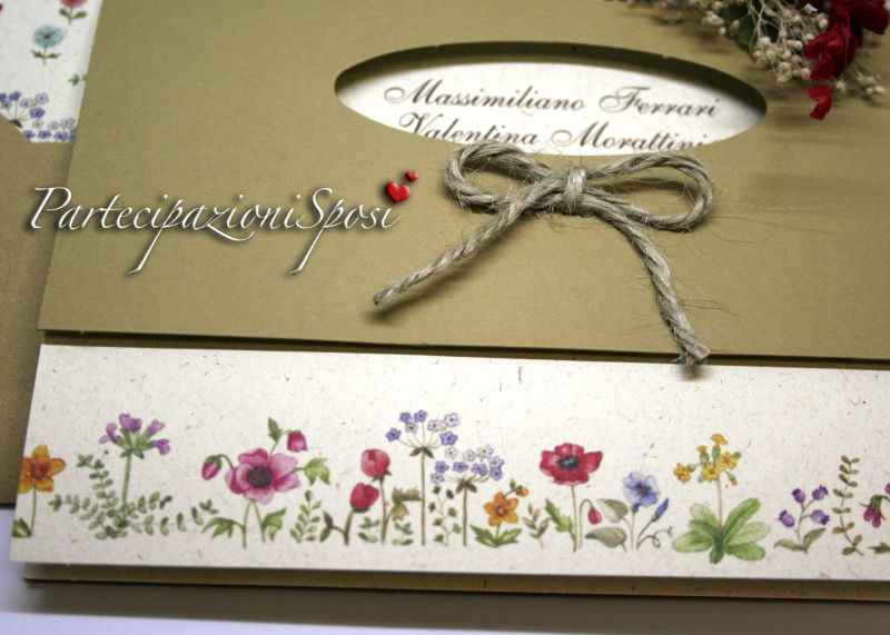 Annunci di nozze dal tema naturale con copertina in cartoncino kraft. Sul davanti c'è un ovale dal quale si intravedono i nomi degli sposi stampti sull'intercalare interno in color naturale e arricchito sul fronte da una stampa di fiori.