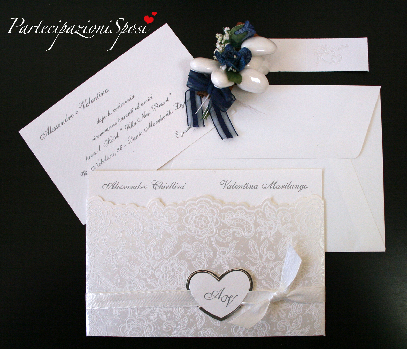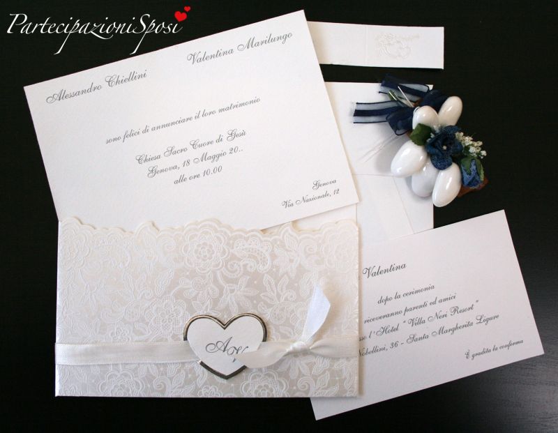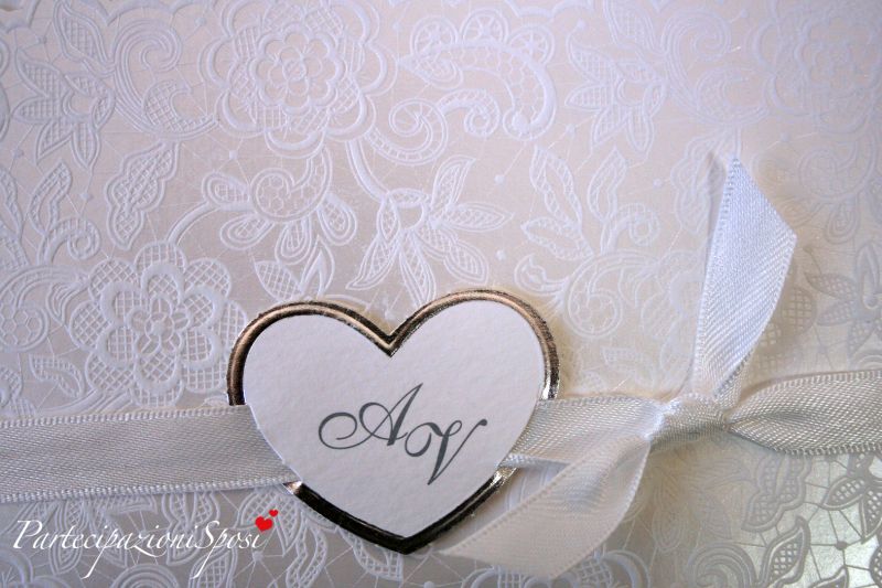 Partecipazione in cartoncino bianco ruvido da personalizzare inserito su custodia realizzata in cartoncino con lavorazione in rilievo opaco e lucido per creare un motivo tipo pizzo. Legato con nastro di raso bianco, un cuore con bordi in argento a caldo e iniziali stampate.