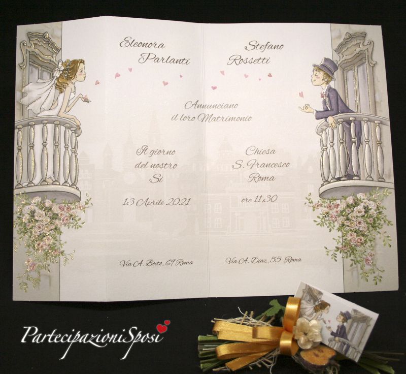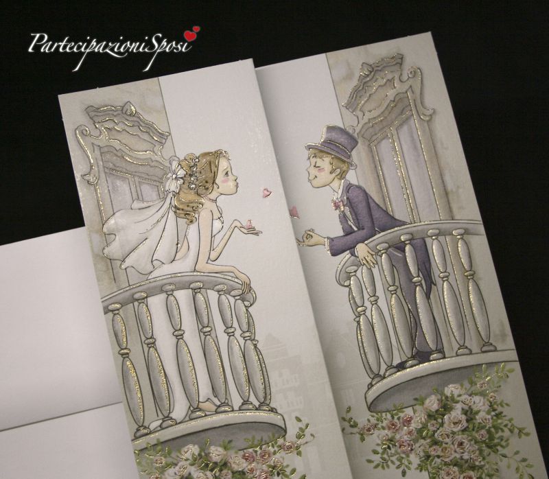 Sono realizzate in cartoncino bianco con stampa di due sposi al balcone. Impreziosito da particolari in rilievo e in oro a caldo. Sull'annuncio andranno stampati tutti i dati riguardanti la cerimonia. Nomi degli sposi, data, ora e luogo; a discrezione dei futuri sposi potranno essere inseriti i relativi indirizzi.