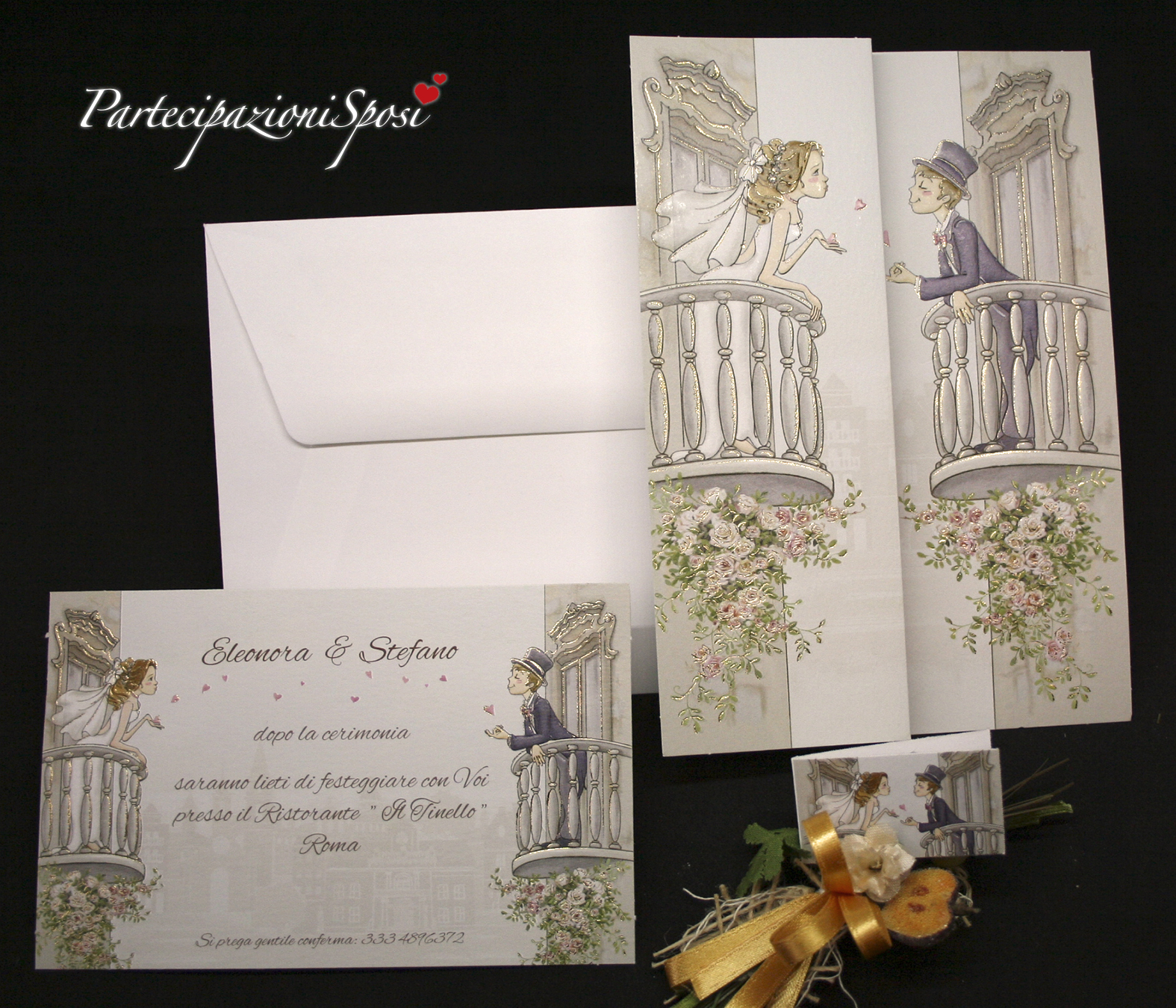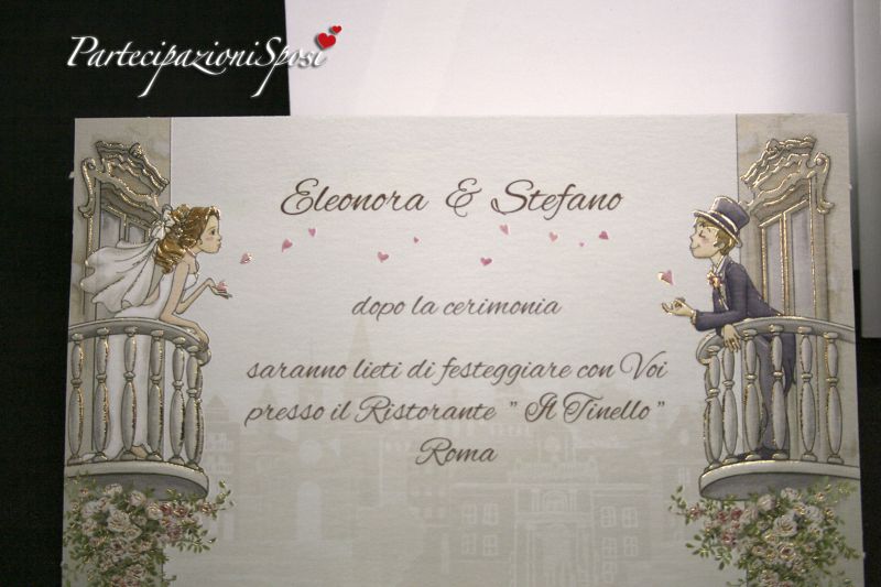 Lo stesso tema dei due sposi al balcone viene ripreso anche sugli inviti realizzati con la stessa tipologia di cartoncino, di stampa e nobilitazioni in rilievo e in oro a caldo. Sugli inviti verranno stampati tutti i dati riguardanti il luogo dei festeggiamenti dopo la cerimonia.