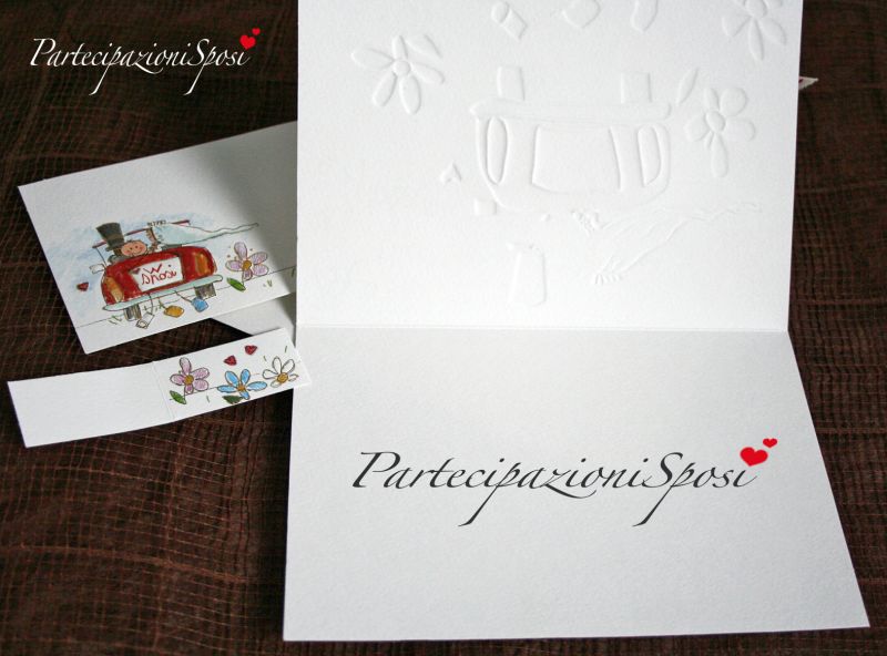 Partecipazione in cartoncino goffrato bianco con stampa spiritosa e particolari in rilievo e in oro a caldo.