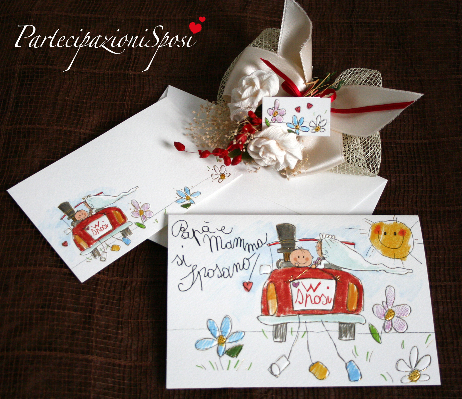 Inviti e bigliettini bomboniere con stampa spiritosa coordinata.