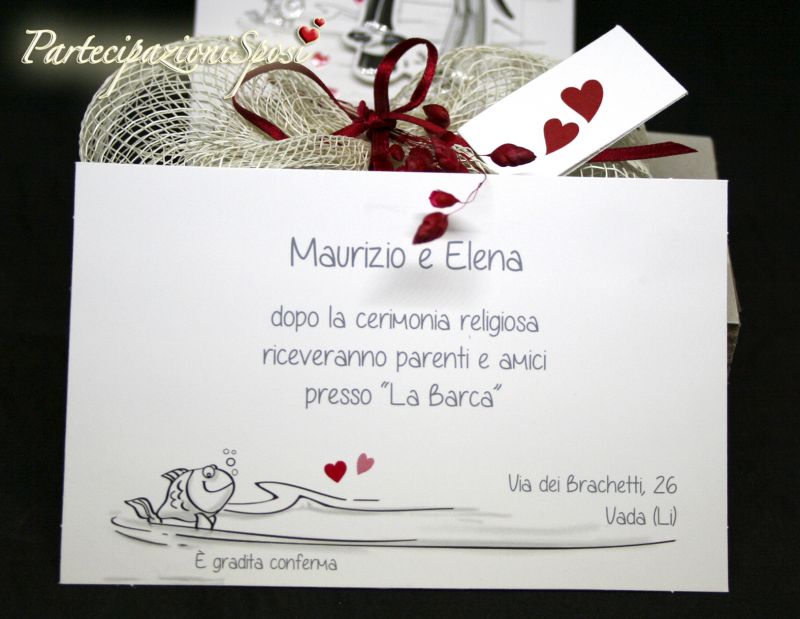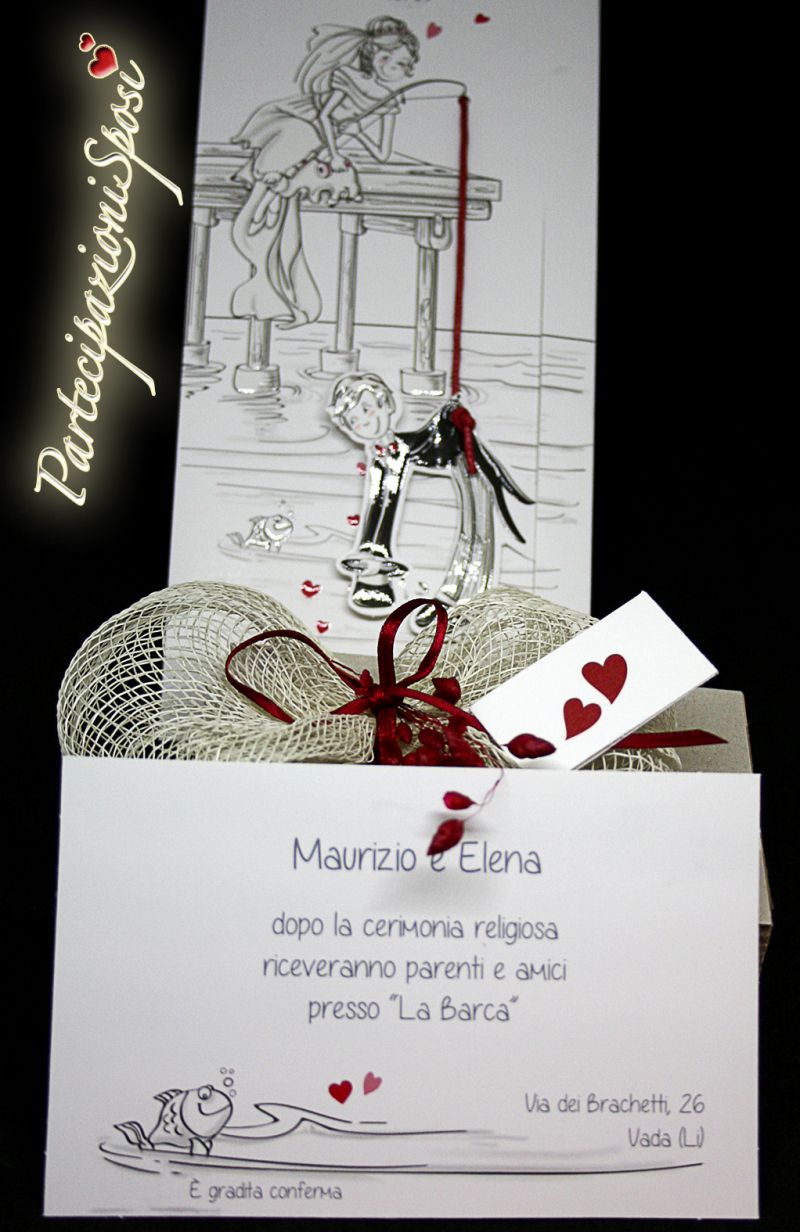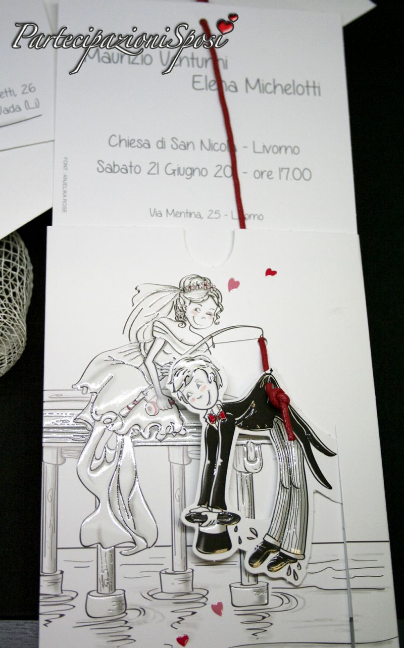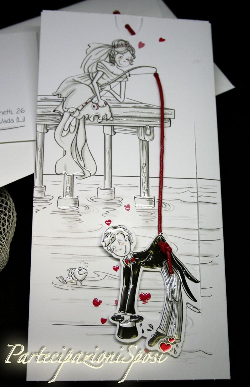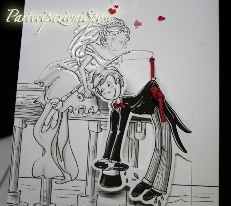 L'annuncio è formato da una coustodia bianca con stampa umoristica e particolari in rilievo lucido. Tirando il cordoncino rosso verso l'alto compare il testo dell'annuncio e lo sposo preso all'amo raggiunge la sposa seduta sul pontile.