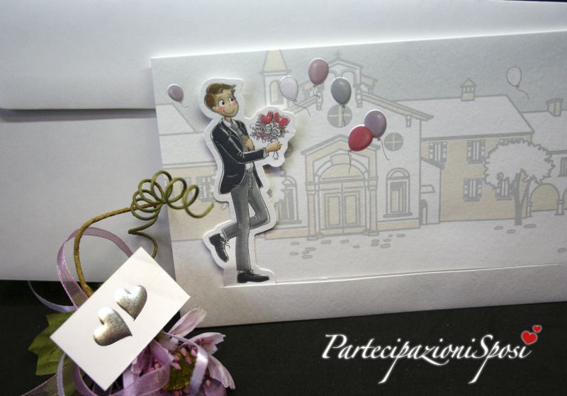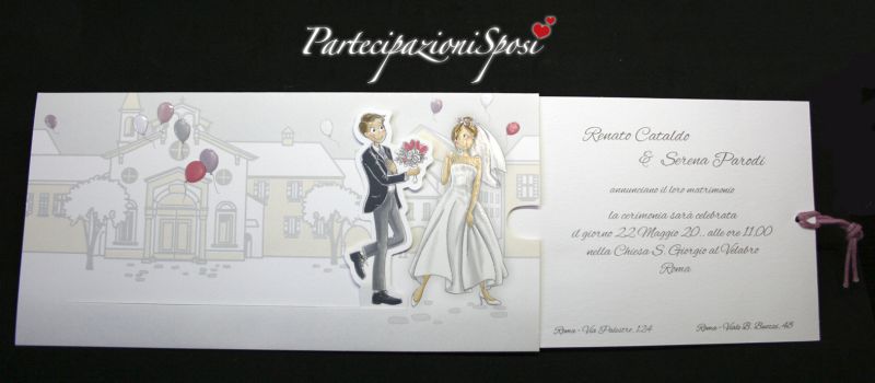 L'annuncio è formato da una tasca bianca con stampa con colori tenui e particolari in rilievo e stampa UV lucida. All'interno della tasca scorre da sinistra verso destra l'annuncio co il testo. Con questo movimento lo sposo che sta a sinistra scorre verso la sposa a destra e le porta il bouquet di rose. Al cartoncino con il testo dell'annuncio è legato un cordoncino lilla che lo impreziosisce.