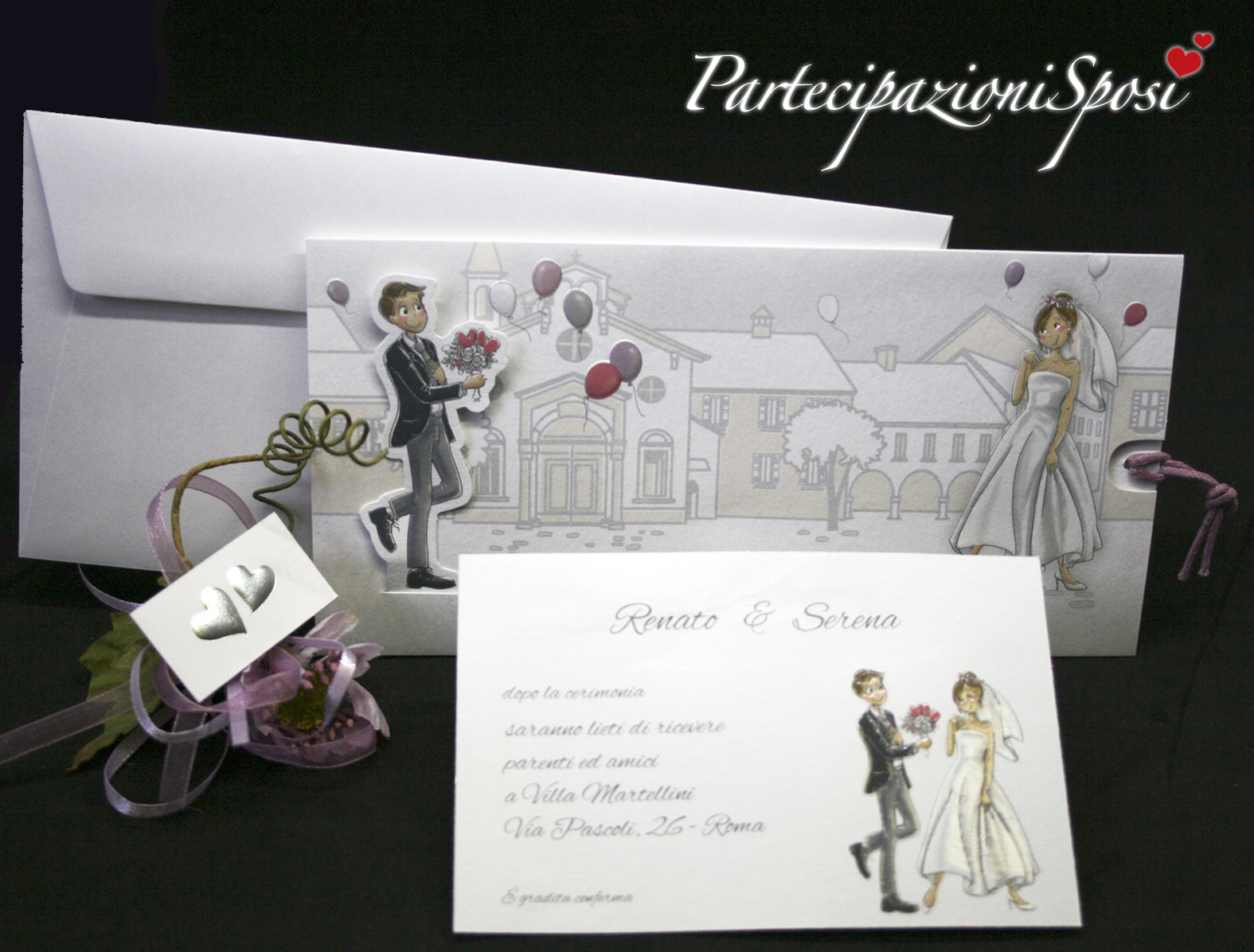 | Caratteristiche del materiale: | Inviti di nozze moderni a tema e colori romantici. L'annuncio è formato da una tasca bianca con stampa con colori tenui e particolari in rilievo e stampa UV lucida. All'interno della tasca scorre da sinistra verso destra l'annuncio co il testo. Con questo movimento lo sposo che sta a sinistra scorre verso la sposa a destra e le porta il bouquet di rose. Al cartoncino con il testo dell'annuncio è legato un cordoncino lilla che lo impreziosisce. L'invito viene stampato insieme all'annuncio. I bigliettini per le bomboniere, o per i sacchettini con i confetti, sono in cartoncino bianco con cuori argentati e in rilevo. Vengono forniti in confezioni da 100 pezzi. Le buste bainche sono comprese nel costo delle partecipazioni. Questa partecipazione è da assemblare. |