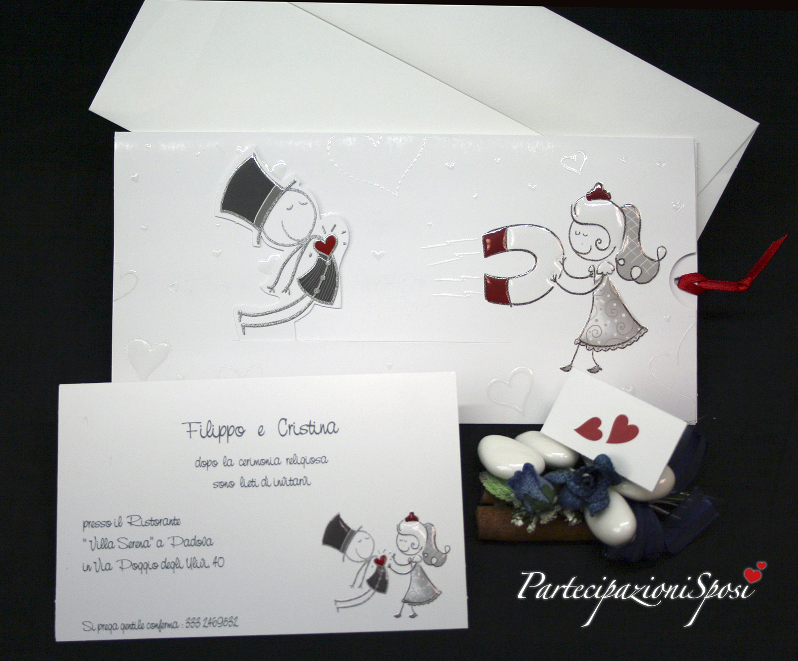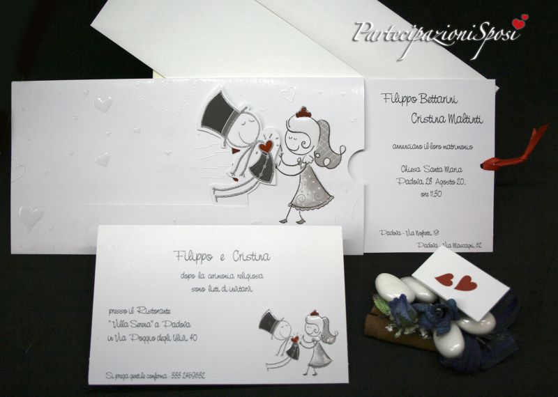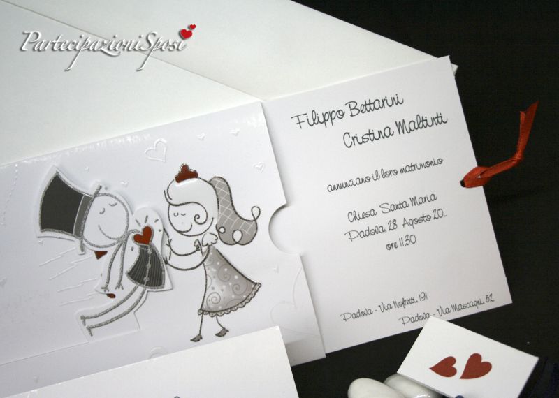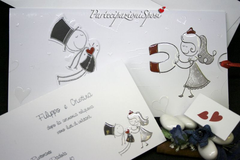 Realizzate in cartoncino patinato bianco con nobilitazioni in rilievo lucido. La partecipazione è composta da due pezzi: tasca e interno che scorre verso destra tirando il nastrino rosso legato alla stessa; in questo modo si crea l'effetto attrazione della calamita. Sia la tasca che l'interno sono stampati e decorati con rilievo lucido. All'interno della tasca vanno sltampati tutti i dati riguardanti la cerimonia: nomi sposi, data, ora e luogo. Il nastrino abbinato è in raso rosso.