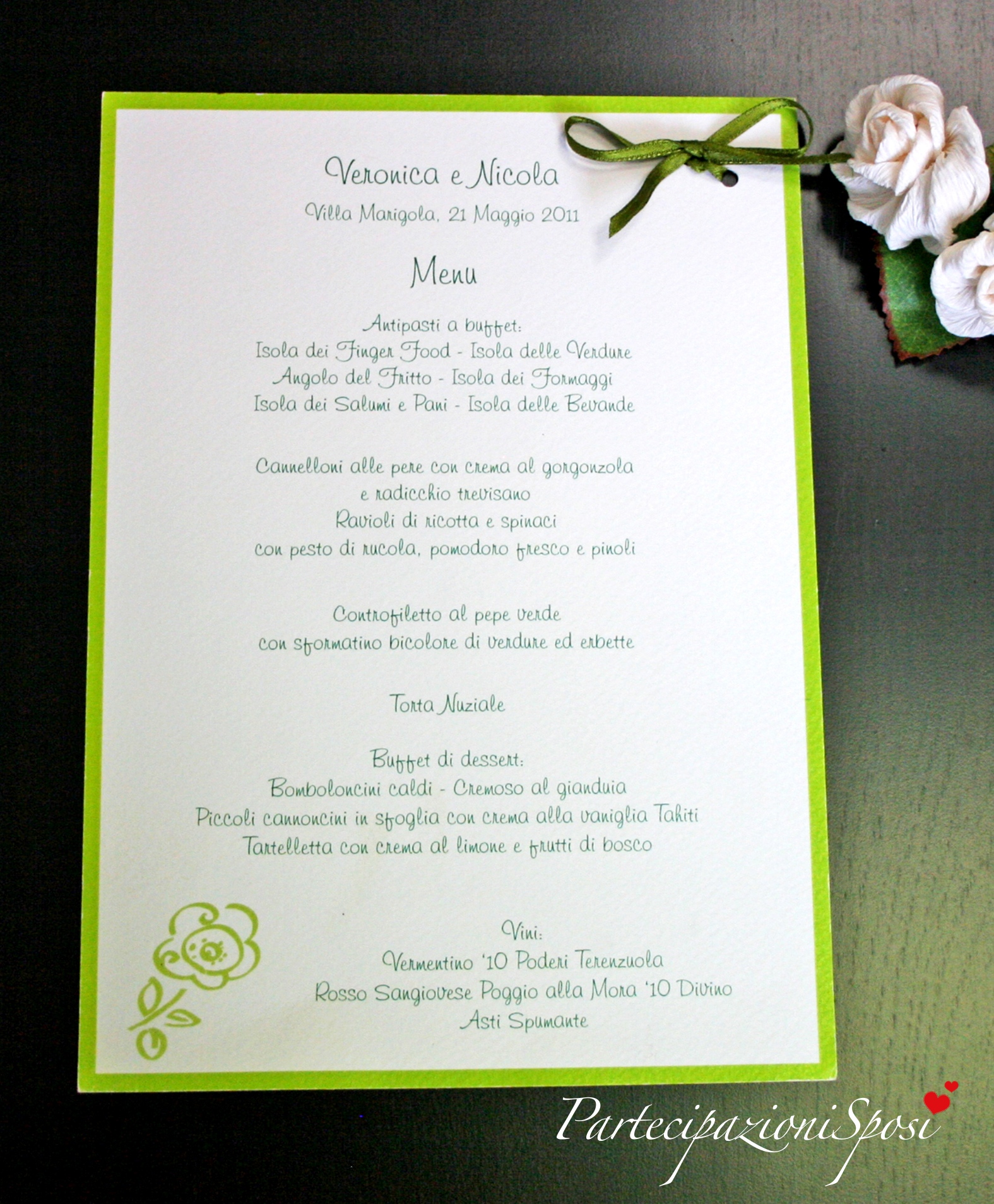 | Caratteristiche del materiale: | Cartoncino martellato bianco con fori per il nastro di raso verde. Possibilità di avere al posto del nastro il cordoncino verde mela. Menu da assemblare |