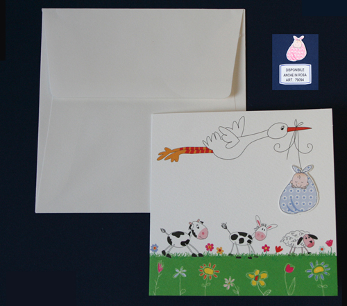 | Caratteristiche del materiale: | Cartoncino bianco stampato con cicogna e applicato "fagotto rosa". |