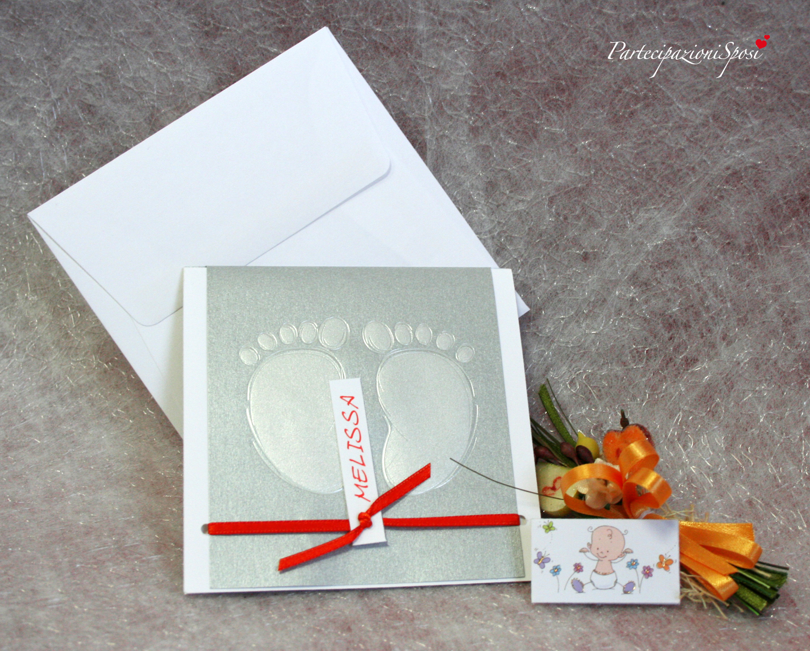 | Caratteristiche del materiale: | Cartoncino bianco da personalizzare legato a copertina in argento con piedini impressi a caldo, tramite nastro arancio. Bigliiettino bomboniera coordinato con stampa e particolari in oro a caldo. |