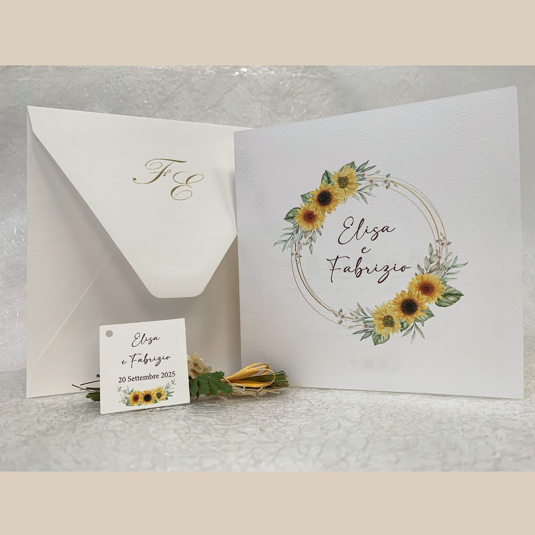 Cartoncino martellato bianco da 200 gr in formato libro quadrato con invito stampato sulla partecipazione.